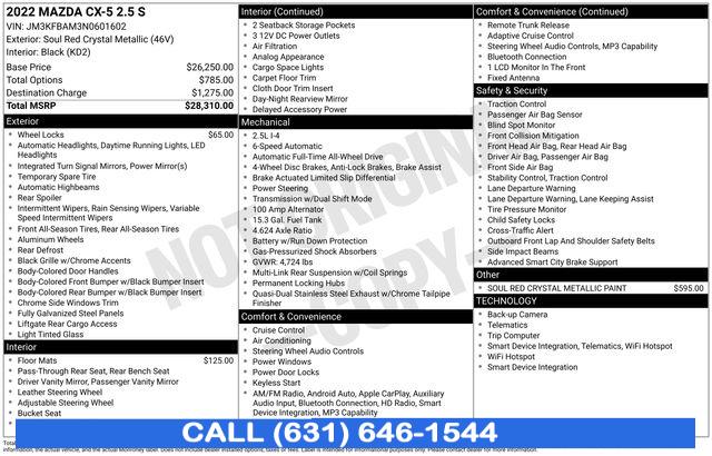 For more information on this 2022 Mazda CX-5, please call Stream Auto Outlet Islip at (631) 646-1544 or with the contact form on this page. This vehicle's vin number is JM3KFBAM3N0601602 and is recorded as being in stock at Stream Auto Outlet Islip at 2232 Sunrise Hwy in Islip. See all cars from this dealership.