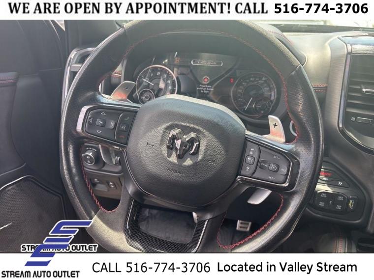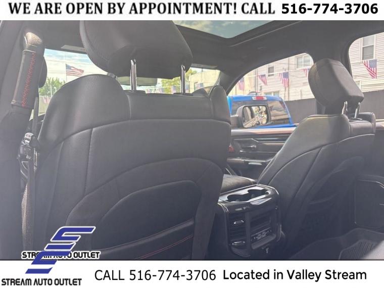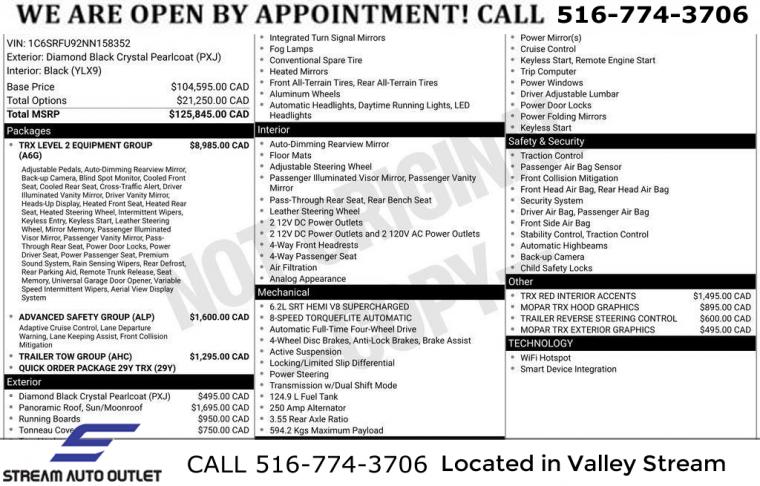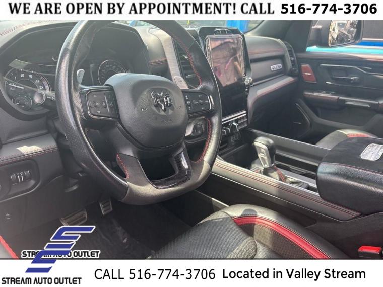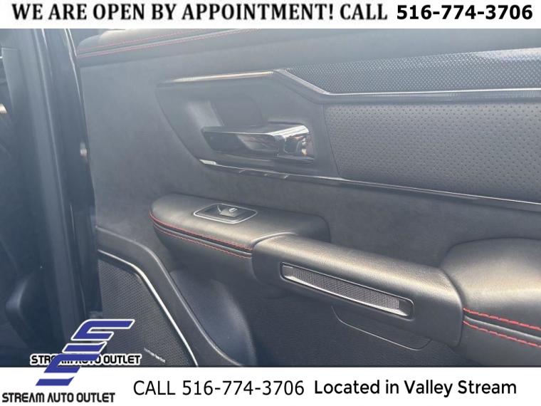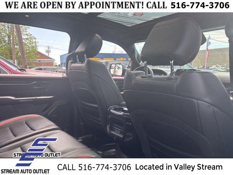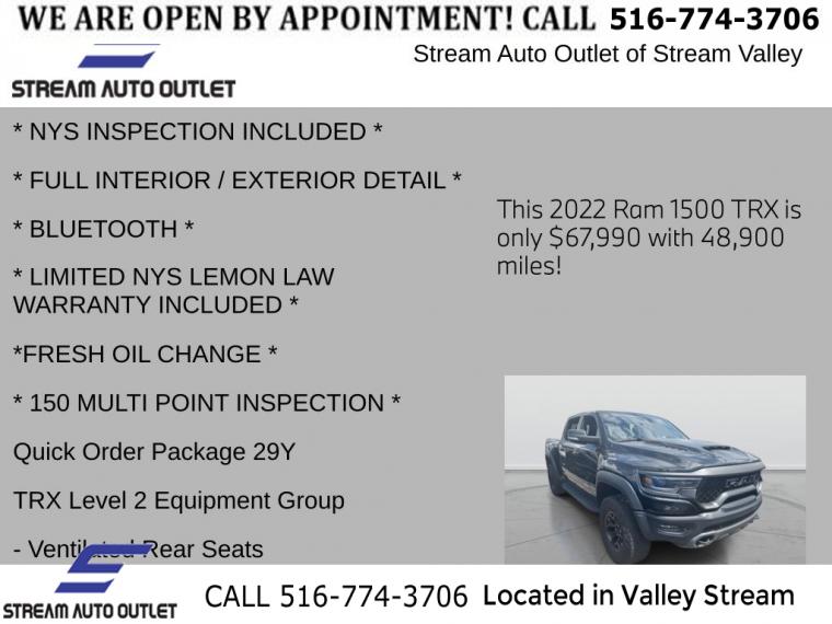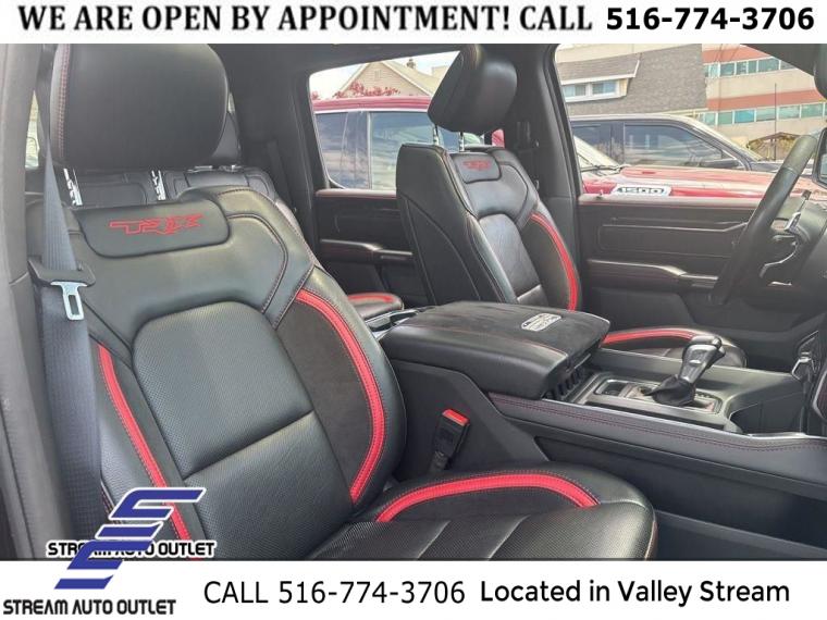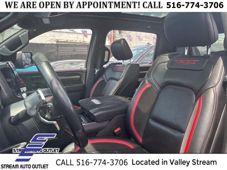 Navigation System, Advanced Safety Group, Quick Order Package 29Y, Trailer Tow Group, TRX Level 2 Equipment Group, 10 Speakers, AM/FM radio: SiriusXM with 360L, harman/kardon 19 Speaker Premium Sound, Radio data system, Radio: Uconnect 5 Nav w/12.0" Display, Air Conditioning, Automatic temperature control, Front dual zone A/C, Rear Window Defroster, Driver Seat Memory, Exterior Mirrors w/Memory, Heads-Up Display, Heated Second Row Seats, Power Adjustable Pedals w/Memory, Power driver seat, Power steering, Power windows, Radio/Driver Seat/Mirrors/Pedals Memory, Rear 60/40 Folding Seat, Remote keyless entry, Steering wheel mounted audio controls, Universal Garage Door Opener, Adaptive suspension, Leather/Suede Flat-Bottom Steering Wheel, Traction control, 2-Door Passive Entry, Front Door Locks, 4-Wheel Disc Brakes, ABS brakes, Dual front impact airbags, Dual front side impact airbags, Front anti-roll bar, Front wheel independent suspension, Low tire pressure warning, Occupant sensing airbag, Overhead airbag, Remote Tailgate Release, Dual-Pane Panoramic Sunroof, Blind Spot & Cross Path Detection, Brake assist, Electronic Stability Control, ParkView Rear Back-Up Camera, Auto High-beam Headlights, Delay-off headlights, Front fog lights, Fully automatic headlights, Panic alarm, Security system, Adaptive Cruise Control w/Stop & Go, Speed control, Auto-dimming door mirrors, Black Exterior Mirrors, Body Color Door Handles, Exterior Mirrors Courtesy Lamps, Exterior Mirrors w/Heating Element, Exterior Mirrors w/Supplemental Signals, Heated door mirrors, LED CHMSL Lamp, MOPAR Off-Road Style Running Boards, MOPAR TRX Exterior Graphics, MOPAR TRX Hood Graphics, Pick-Up Box Lighting, Power door mirrors, Power-Folding Mirrors, Rear step bumper, Turn signal indicator mirrors, #2 Seat Foam Cushion, Apple CarPlay/Android Auto, Auto-dimming Rear-View mirror, Center Console Parts Module, Compass, Digital Rearview Mirror, Dome Dual LED Reading Lamp, Driver door bin, Driver/Passenger Wrapped Assist Handles, Front Door Accent Lighting, Front reading lights, Full Length Premium Upgraded Floor Console, Heated Steering Wheel, Illuminated entry, IP LED Ambient Light Pipe, Lane Keep Assist, Leather Shift Knob, Leather steering wheel, Luxury Front Door Trim Panel, MOPAR Bright Pedal Kit, Outside temperature display, Overhead console, ParkSense Front/Rear Park Assist w/Stop, Passenger vanity mirror, Pedestrian Emergency Braking, Premium Wrapped IP Bezel, Rear Door Accent Lighting, Rear seat center armrest, Sport steering wheel, Sun Visors w/Illuminated Vanity Mirrors, Surround View Camera System, Tachometer, Tailgate Ajar Warning Lamp, Telescoping steering wheel, Tilt steering wheel, Trip computer, TRX Red Interior Accents, Voltmeter, Wireless Charging Pad, 4 Way Front Headrests, Bucket Seats, Cloth/Vinyl Bucket Seats, Front Bucket Seats, Heated Front Seats, Leather Trimmed Bucket Seats, Power 4-Way Driver Lumbar Adjust, Power 4-Way Passenger Lumbar Adjust, Power 8-Way Driver & Passenger Seats, Rear 60/40 Folding Split Recline Seat, Split folding rear seat, Ventilated Front Seats, Ventilated Rear Seats, Front Center Armrest w/Storage, Front Seat Back Map Pockets, Passenger door bin, Rear Underseat Compartment Storage, Tri-Fold Tonneau Cover, Trailer Brake Control, Trailer Light Check, Trailer Reverse Steering Control, Trailer Tire Pressure Monitoring System, Alloy wheels, Wheels: 18" x 9" Black Paint/Polish Aluminum, Rain Sensitive Windshield Wipers, Variably intermittent wipers, 3.55 Rear Axle Ratio, * NYS INSPECTION INCLUDED *, * FULL INTERIOR / EXTERIOR DETAIL *, * BLUETOOTH *, * LIMITED NYS LEMON LAW WARRANTY INCLUDED *, *FRESH OIL CHANGE *, * 150 MULTI POINT INSPECTION *