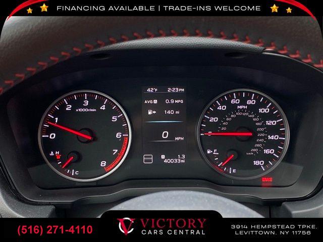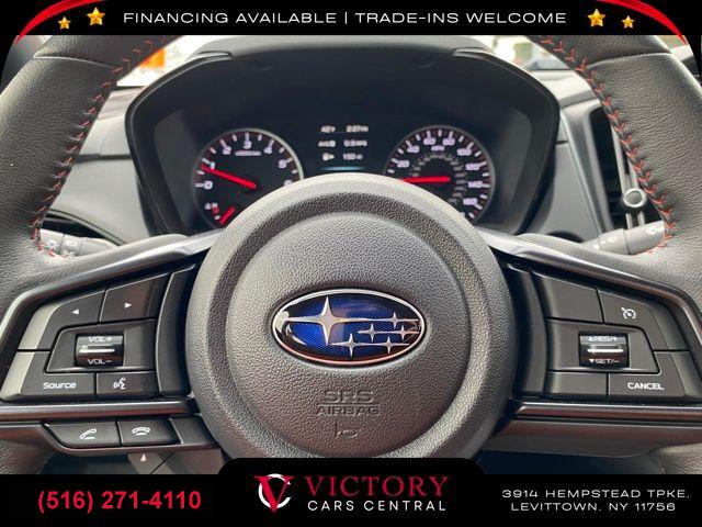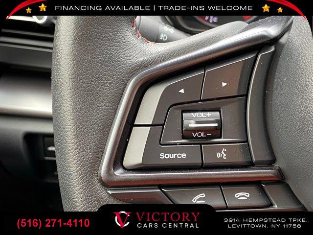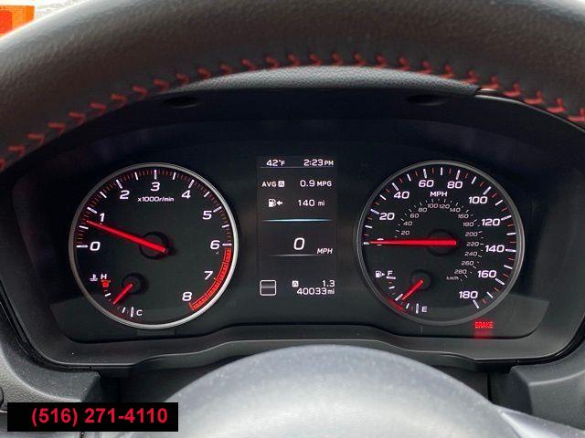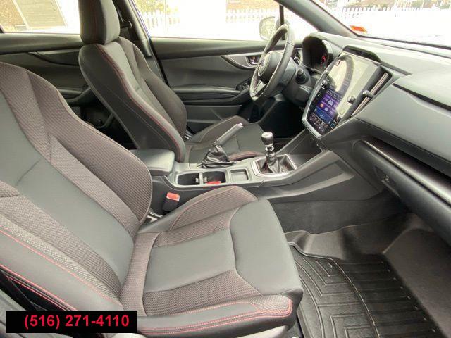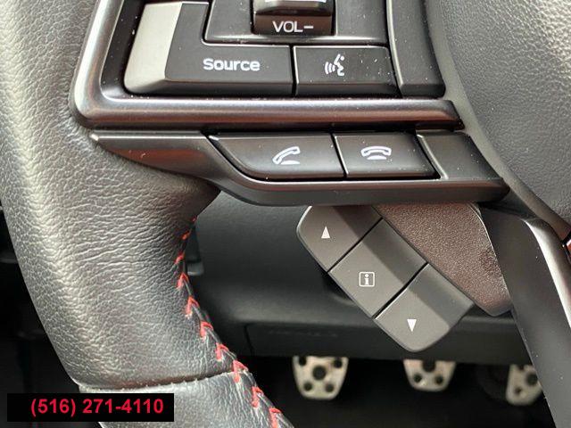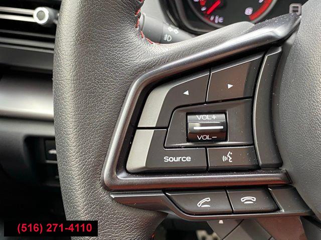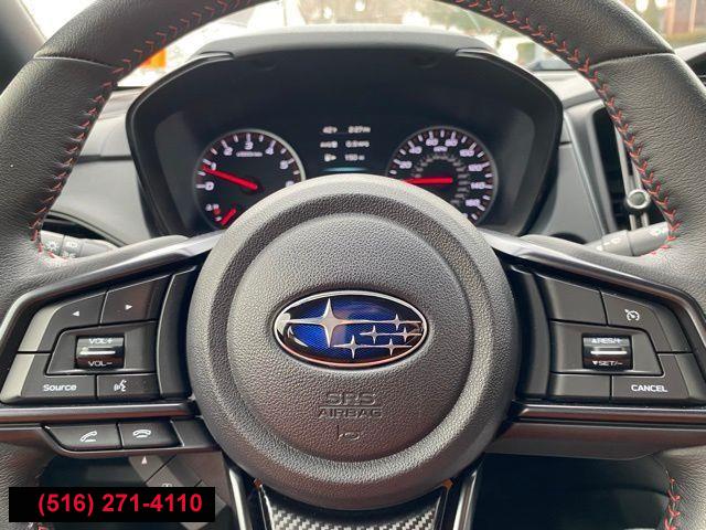 Standard Model (6MT), 6 Speakers, AM/FM radio: SiriusXM, Radio data system, Radio: Subaru STARLINK 11.6" Multimedia Plus Sys, Air Conditioning, Automatic temperature control, Front dual zone A/C, Rear window defroster, Power steering, Power windows, Remote keyless entry, Steering wheel mounted audio controls, Four wheel independent suspension, Speed-sensing steering, Traction control, 4-Wheel Disc Brakes, ABS brakes, Dual front impact airbags, Dual front side impact airbags, Emergency communication system: STARLINK Safety and Security (Subscription Required), Front anti-roll bar, Knee airbag, Low tire pressure warning, Occupant sensing airbag, Overhead airbag, Rear anti-roll bar, Brake assist, Electronic Stability Control, Exterior Parking Camera Rear, Auto High-beam Headlights, Front fog lights, Fully automatic headlights, Panic alarm, Security system, Speed control, Bumpers: body-color, Heated door mirrors, Power door mirrors, Spoiler, Auto-dimming Rear-View mirror, Driver door bin, Driver vanity mirror, Front reading lights, Illuminated entry, Leather Shift Knob, Leather steering wheel, Outside temperature display, Overhead console, Passenger vanity mirror, Performance Design Heated Front Bucket Seats, Rear seat center armrest, Sport steering wheel, STARLINK/Apple CarPlay/Android Auto, Tachometer, Telescoping steering wheel, Tilt steering wheel, Trip computer, Cloth Upholstery w/Red Stitching, Front Bucket Seats, Front Center Armrest, Heated front seats, Split folding rear seat, Passenger door bin, Alloy wheels, Wheels: 18" x 8.5" Dark Gray Finish Alum Alloy, Variably intermittent wipers