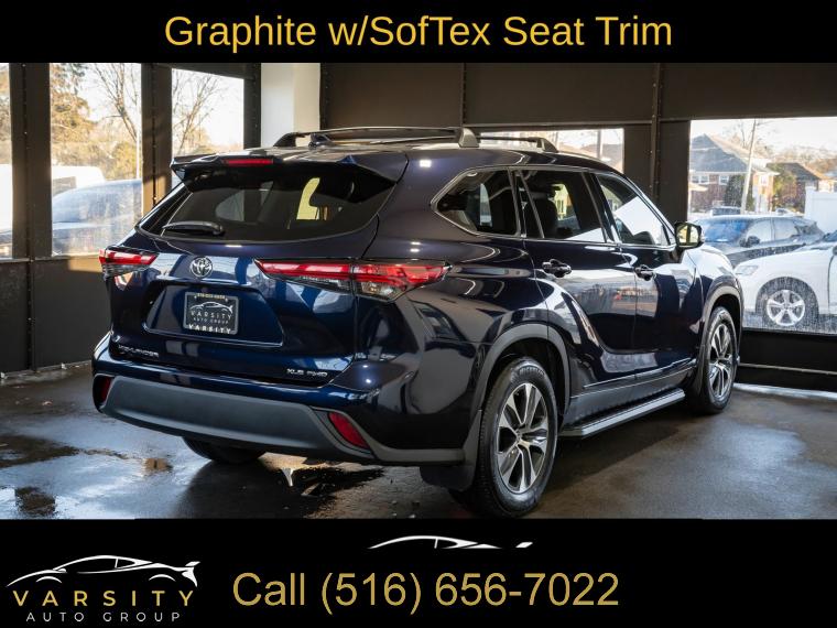 2022 Toyota Highlander XLE, Blueprint exterior paint, Graphite w/SofTex Seat Trim, One Owner, AWD, 3.003 Axle Ratio, 3rd row seats: split-bench, 4-Wheel Disc Brakes, 6 Speakers, ABS brakes, Air Conditioning, Alloy wheels, AM/FM radio: SiriusXM, Apple CarPlay/Android Auto, Auto High-beam Headlights, Auto-dimming Rear-View mirror, Automatic temperature control, Brake assist, Bumpers: body-color, Delay-off headlights, Driver door bin, Driver vanity mirror, Dual front impact airbags, Dual front side impact airbags, Electronic Stability Control, Emergency communication system: Safety Connect with 1-year trial, Exterior Parking Camera Rear, Four wheel independent suspension, Front anti-roll bar, Front Bucket Seats, Front Center Armrest, Front dual zone A/C, Front fog lights, Front reading lights, Fully automatic headlights, Garage door transmitter: HomeLink, Heated door mirrors, Heated Front Bucket Seats, Heated front seats, Illuminated entry, Knee airbag, Leather Shift Knob, Low tire pressure warning, Occupant sensing airbag, Outside temperature display, Overhead airbag, Overhead console, Panic alarm, Passenger door bin, Passenger vanity mirror, Power door mirrors, Power driver seat, Power Liftgate, Power moonroof, Power passenger seat, Power steering, Power windows, Radio: Audio Plus, Rear air conditioning, Rear anti-roll bar, Rear reading lights, Rear window defroster, Rear window wiper, Reclining 3rd row seat, Remote keyless entry, Roof rack: rails only, Security system, SofTex Seat Trim, Speed control, Speed-sensing steering, Split folding rear seat, Spoiler, Steering wheel mounted audio controls, Tachometer, Telescoping steering wheel, Tilt steering wheel, Traction control, Trip computer, Turn signal indicator mirrors, Variably intermittent wipers, Wheels: 18" Machined-Finish Alloy. Blueprint 2022 Toyota Highlander XLE AWD 8-Speed Automatic 3.5L V6 DOHC Odometer is 8827 miles below market average! 20/27 City/Highway MPG