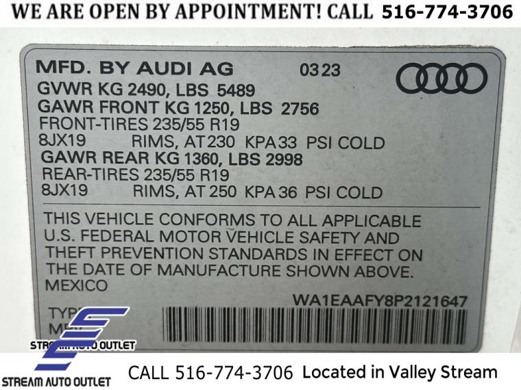 For more information on this 2023 Audi Q5, please call Stream Auto Outlet Valley Stream at (516) 774-3706 or with the contact form on this page. This vehicle's vin number is WA1EAAFY8P2121647 and is recorded as being in stock at Stream Auto Outlet Valley Stream at 324 W Merrick Rd in Valley Stream. See all cars from this dealership.