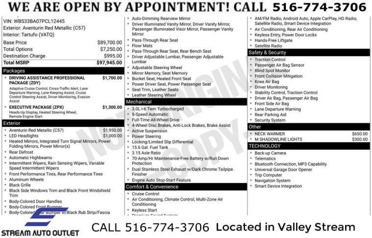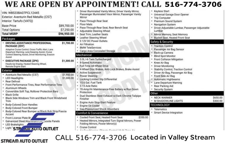 Navigation System, Driving Assistance Professional Package, EXECUTIVE PKG, 16 Speakers, AM/FM radio: SiriusXM, harman/kardon Surround Sound System, harman/kardonĀ® Speakers, Radio data system, Radio: AM/FM Audio System, SiriusXM Satellite Radio, Air Conditioning, Automatic temperature control, Front dual zone A/C, Neck Warmer, Rear air conditioning, Rear window defroster, Head-Up Display, Lumbar Support, Memory seat, Power driver seat, Power steering, Power windows, Remote Engine Start, Remote keyless entry, Steering wheel mounted audio controls, Adaptive suspension, Four wheel independent suspension, Speed-sensing steering, Traction control, 4-Wheel Disc Brakes, ABS brakes, Dual front impact airbags, Dual front side impact airbags, Emergency communication system: BMW Assist eCall, Front anti-roll bar, Integrated roll-over protection, Knee airbag, Low tire pressure warning, Occupant sensing airbag, Rear anti-roll bar, Brake assist, Electronic Stability Control, Exterior Parking Camera Rear, Auto High-beam Headlights, Delay-off headlights, Fully automatic headlights, Panic alarm, Security system, Active Driving Assistant Pro, Extended Traffic Jam Assistant, Speed control, Auto-dimming door mirrors, Bumpers: body-color, Convertible roof wind blocker, Heated door mirrors, Icon Adaptive LED Headlights w/Laserlight, M Shadowline Lights, Power door mirrors, Turn signal indicator mirrors, Auto-dimming Rear-View mirror, BMW Assist eCall, BMW TeleServices, Compass, ConnectedDrive Services, Convertible roof lining, Driver door bin, Driver vanity mirror, Enhanced USB/Bluetooth Plus Smartphone Integration, Front reading lights, Garage door transmitter, Heated Steering Wheel, Illuminated entry, Leather Shift Knob, Live Cockpit Pro w/Navi, Outside temperature display, Overhead console, Passenger vanity mirror, Power convertible roof, Rear reading lights, Rear seat center armrest, Sport steering wheel, Tachometer, Telescoping steering wheel, Tilt steering wheel, Trip computer, Extended Merino Leather Upholstery, Front Bucket Seats, Front Center Armrest, Front Ventilated Seats, Heated Front Seats, Heated front seats, M Sport Seats, Power Front Seats, Power passenger seat, Passenger door bin, Alloy wheels, Wheels: 19" x 9.5" Fr/20" x 10.5" Rr (Style 826M), Wheels: 19" x 9.5" Fr/20" x 10.5" Rr Silver, Glass rear window, Rain sensing wipers, Speed-Sensitive Wipers, Variably intermittent wipers, * NYS INSPECTION INCLUDED *, * FULL INTERIOR / EXTERIOR DETAIL *, * BLUETOOTH *, * LIMITED NYS LEMON LAW WARRANTY INCLUDED *, *FRESH OIL CHANGE *, * 150 MULTI POINT INSPECTION *