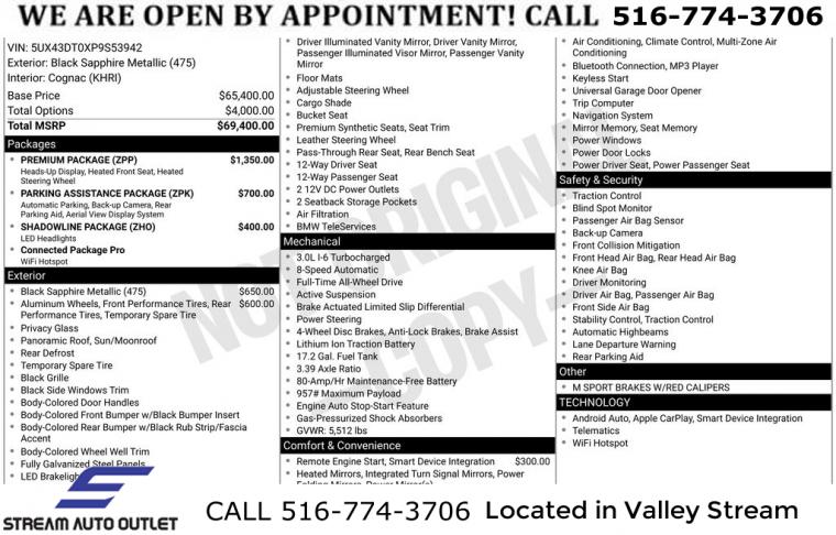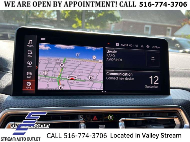• Navigation System, Connected Package Pro, Parking Assistance Package, Premium Package, Shadowline Package, 12 Speakers, AM/FM radio: SiriusXM, ConnectedDrive Services, Hi-Fi Sound System, Radio data system, Radio: AM/FM Audio System, SiriusXM Satellite Radio, Air Conditioning, Automatic temperature control, Front dual zone A/C, Rear air conditioning, Rear window defroster, Head-Up Display, Memory seat, Power driver seat, Power steering, Power windows, Remote Engine Start, Remote keyless entry, Steering wheel mounted audio controls, Adaptive suspension, Four wheel independent suspension, Speed-sensing steering, Traction control, 4-Wheel Disc Brakes, ABS brakes, Anti-whiplash front head restraints, Dual front impact airbags, Dual front side impact airbags, Emergency communication system: BMW Assist eCall, Front anti-roll bar, Increased Top Speed Limiter, Knee airbag, Low tire pressure warning, M Sport Brakes w/Red Calipers, Occupant sensing airbag, Overhead airbag, Rear anti-roll bar, Power moonroof: Panorama, Power Liftgate, Brake assist, Electronic Stability Control, Exterior Parking Camera Rear, Rear-View Camera, Auto High-beam Headlights, Delay-off headlights, Fully automatic headlights, Panic alarm, Security system, Speed control, Auto-dimming door mirrors, Bumpers: body-color, Extended Shadowline Trim, Heated door mirrors, M Shadowline Lights, Power door mirrors, Turn signal indicator mirrors, Active Park Distance Control, Apple CarPlay & Android Auto Compatibility, Auto-dimming Rear-View mirror, BMW Assist eCall, BMW TeleServices, Driver door bin, Driver vanity mirror, Enhanced USB & Bluetooth w/Smartphone Integration, Front reading lights, Garage door transmitter, Heated Steering Wheel, Illuminated entry, Live Cockpit Pro w/Navi, Outside temperature display, Overhead console, Parking Assistant Plus, Passenger vanity mirror, Rear reading lights, Rear seat center armrest, Sport steering wheel, Surround View w/3D View, Tachometer, Telescoping steering wheel, Tilt steering wheel, Trip computer, WiFi Hotspot, Driver Lumbar Support, Front Bucket Seats, Front Center Armrest, Heated Front Seats, Perforated SensaTec Upholstery, Power Front Seats, Power passenger seat, Split folding rear seat, Sport Seats, Passenger door bin, Alloy wheels, Wheels: 19" x 7.5" M Y-Spoke Bi-Color (Style 887M), Wheels: 20" x 8.0" Fr/20" x 9.5" Rr (Style 699M), Rain sensing wipers, Speed-Sensitive Wipers, Variably intermittent wipers, 3.39 Axle Ratio, * NYS INSPECTION INCLUDED *, * FULL INTERIOR / EXTERIOR DETAIL *, * BLUETOOTH *, * LIMITED NYS LEMON LAW WARRANTY INCLUDED *, *FRESH OIL CHANGE *, * 150 MULTI POINT INSPECTION *