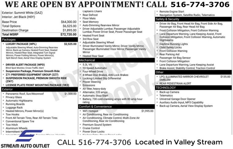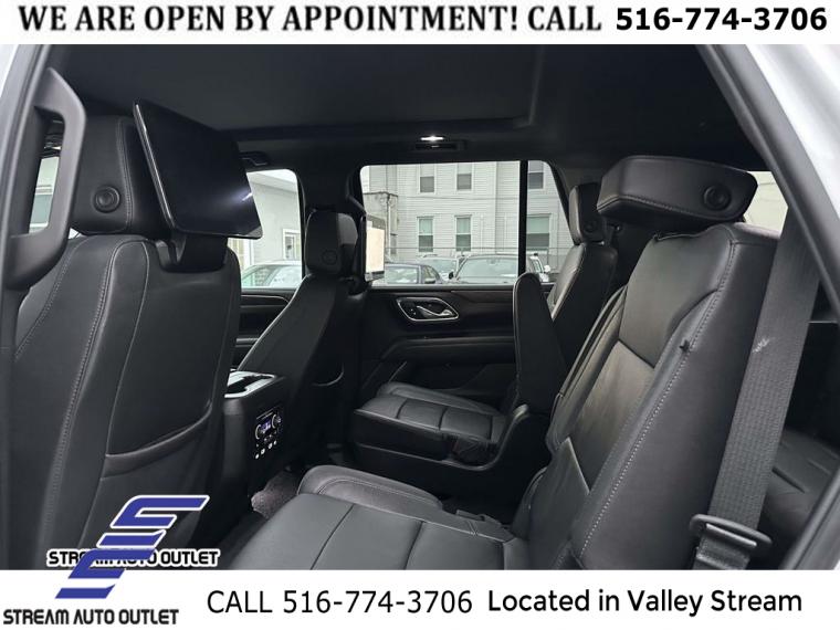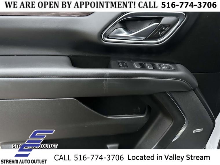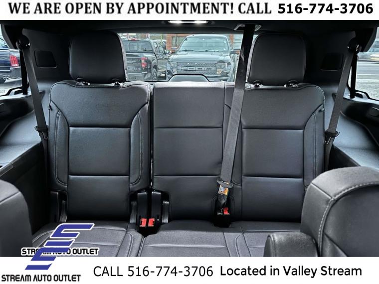 Navigation System, Driver Alert Package, License Plate Front Mounting Package, Luxury Package, Preferred Equipment Group 2Z7, 9 Speakers, AM/FM radio: SiriusXM with 360L, Bose 9-Speaker Stereo Audio System Feature, Premium audio system: Chevrolet Infotainment 3 Premium, Radio: Chevrolet Infotainment 3 Premium System, SiriusXM Radio w/360L, Air Conditioning, Automatic temperature control, Front dual zone A/C, Rear air conditioning, Rear window defroster, Enhanced Driver Information Center, Hands-Free Rear Power Programmable Liftgate, Memory seat, Memory Settings, Power driver seat, Power steering, Power windows, Remote keyless entry, Remote Start, Steering wheel mounted audio controls, Universal Home Remote, Four wheel independent suspension, Premium Smooth Ride Suspension, Speed-sensing steering, Traction control, Wrapped Steering Wheel, 4-Wheel Disc Brakes, ABS brakes, Dual front impact airbags, Dual front side impact airbags, Emergency communication system: OnStar and Chevrolet connected services capable, Front anti-roll bar, Low tire pressure warning, Occupant sensing airbag, Overhead airbag, Rear anti-roll bar, Dual-Pane Power Panoramic Sunroof, Power Liftgate, Brake assist, Electronic Stability Control, Hill Descent Control, Auto High-beam Headlights, Delay-off headlights, Fully automatic headlights, LED Daytime Running Lamps, Driver & Front Outboard Passenger Airbags, Panic alarm, Security system, Speed control, 2-Speed Active Electronic AutoTrac Transfer Case, Black Tubular Assist Steps, Bright Front & Rear Door Sill Plates, Bumpers: body-color, Front High-Approach Angle Fascia, Heated door mirrors, Illuminated Mirror Chevrolet Emblem (LPO), Outside Heated Power-Adjustable Mirrors, Power door mirrors, Roof rack: rails only, Spoiler, 1st & 2nd Row Color-Keyed Carpeted Floor Mats, Apple CarPlay/Android Auto, Auto-Dimming Inside Rear-View Mirror, Auto-dimming Rear-View mirror, Color-Keyed Carpeting Floor Covering, Compass, Driver door bin, Driver vanity mirror, Front reading lights, Garage door transmitter, HD Surround Vision, Heated Steering Wheel, Illuminated entry, Infotainment Display, Lane Change Alert w/Side Blind Zone Alert, Memory Settings for Driver, Outside temperature display, Overhead console, Passenger vanity mirror, Power Tilt & Telescopic Steering Column, Rear Cross Traffic Alert, Rear Pedestrian Alert, Rear reading lights, Rear seat center armrest, Rear Seat Media System, Tachometer, Telescoping steering wheel, Tilt steering wheel, Trip computer, Voltmeter, Wireless Charging, 10-Way Power Driver & Passenger Seat Adjusters, 2nd Row Pwr Release 60/40 Split-Folding Bench Seat, 3rd Row 60/40 Power-Folding Split-Bench Seat, 3rd row seats: split-bench, Floor Console w/Storage Area, Front Bucket Seats, Front Center Armrest, Front High-Back Reclining Bucket Seats, Heated 2nd Row Outboard Seats, Heated Driver & Front Passenger Seats, Heated front seats, Leather-Appointed Seat Trim, Power passenger seat, Power Release 2nd Row Bucket Seats, Split folding rear seat, Passenger door bin, Red Horizontal-Mounted Recovery Hooks, Alloy wheels, Wheels: 20" x 9" Machined Aluminum, Rain sensing wipers, Rear window wiper, Variably intermittent wipers, 3.23 Rear Axle Ratio, * NYS INSPECTION INCLUDED *, * FULL INTERIOR / EXTERIOR DETAIL *, * BLUETOOTH *, * LIMITED NYS LEMON LAW WARRANTY INCLUDED *, *FRESH OIL CHANGE *, * 150 MULTI POINT INSPECTION *