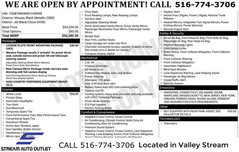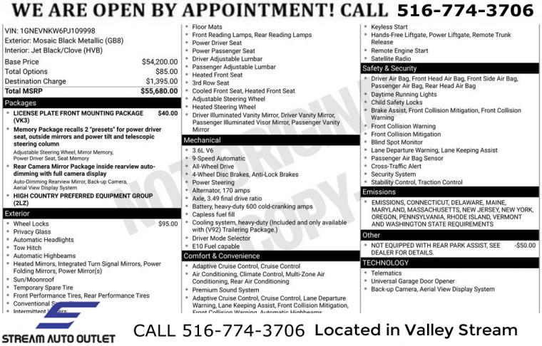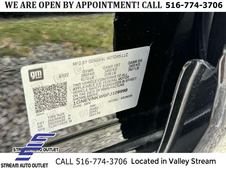 Navigation System, Front License Plate Bracket Mounting Package, Preferred Equipment Group 2LZ, 10 Speakers, AM/FM radio: SiriusXM with 360L, Bose Premium 10-Speaker Audio System Feature, Premium audio system: Chevrolet Infotainment 3 Plus, Radio data system, Radio: Chevrolet Infotainment 3 Plus System w/Navi, SiriusXM w/360L, Air Conditioning, Automatic temperature control, Front dual zone A/C, Rear air conditioning, Rear window defroster, 6-Way Power Front Passenger Seat, 8-Way Power Driver Seat Adjuster, Memory seat, Power driver seat, Power steering, Power windows, Remote keyless entry, Steering wheel memory, Steering wheel mounted audio controls, Four wheel independent suspension, Speed-sensing steering, Traction control, 4-Wheel Disc Brakes, ABS brakes, Dual front impact airbags, Dual front side impact airbags, Emergency communication system, Front anti-roll bar, Low tire pressure warning, Occupant sensing airbag, Overhead airbag, Rear anti-roll bar, Power moonroof: Dual SkyScape, Power Liftgate, Brake assist, Electronic Stability Control, Exterior Parking Camera Rear, Auto High-beam Headlights, Delay-off headlights, Fully automatic headlights, Panic alarm, Security system, Speed control, Auto-dimming door mirrors, Bumpers: body-color, Heated door mirrors, Power door mirrors, Spoiler, Turn signal indicator mirrors, Apple CarPlay/Android Auto, Auto-dimming Rear-View mirror, Compass, Driver door bin, Driver vanity mirror, Front reading lights, Garage door transmitter, Heated steering wheel, Illuminated entry, Leather steering wheel, Not Equipped w/Rear Park Assist, Outside temperature display, Overhead console, Passenger vanity mirror, Rear reading lights, Tachometer, Telescoping steering wheel, Tilt steering wheel, Trip computer, Voltmeter, 3rd row seats: split-bench, Front Bucket Seats, Front Center Armrest, Front Passenger 2-Way Power Lumbar, Heated 2nd Row Outboard Position Seats, Heated Driver & Front Passenger Seats, Heated front seats, Heated rear seats, Perforated Leather-Appointed Seat Trim, Power Driver Lumbar Control, Power passenger seat, Ventilated Driver & Front Passenger Seats, Ventilated front seats, Passenger door bin, 20" Polished Aluminum Wheels, Alloy wheels, Bright Thatcham Wheel Locks (LPO), Rear window wiper, Variably intermittent wipers, 3.49 Axle Ratio, * NYS INSPECTION INCLUDED *, * FULL INTERIOR / EXTERIOR DETAIL *, * BLUETOOTH *, * LIMITED NYS LEMON LAW WARRANTY INCLUDED *, *FRESH OIL CHANGE *, * 150 MULTI POINT INSPECTION *