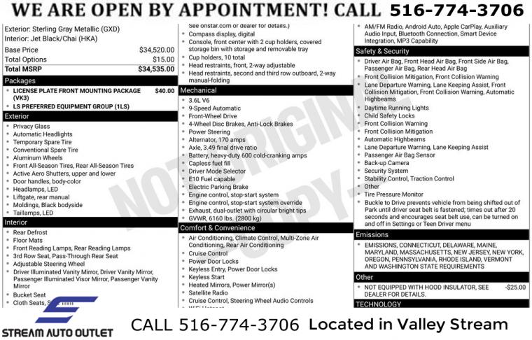 Front License Plate Bracket Mounting Package, Preferred Equipment Group 1LS, 6 Speakers, 6-Speaker Audio System Feature, AM/FM radio: SiriusXM, Radio data system, Radio: Chevrolet Infotainment System AM/FM Stereo, SiriusXM Radio, Air Conditioning, Automatic temperature control, Front dual zone A/C, Rear air conditioning, Rear window defroster, Power steering, Power windows, Remote keyless entry, Steering wheel mounted audio controls, Four wheel independent suspension, Speed-sensing steering, Traction control, 4-Wheel Disc Brakes, ABS brakes, Dual front impact airbags, Dual front side impact airbags, Emergency communication system, Front anti-roll bar, Low tire pressure warning, Occupant sensing airbag, Overhead airbag, Rear anti-roll bar, Brake assist, Electronic Stability Control, Exterior Parking Camera Rear, Auto High-beam Headlights, Delay-off headlights, Fully automatic headlights, Panic alarm, Security system, Speed control, Bumpers: body-color, Heated door mirrors, Not Equipped w/Hood Insulator, Power door mirrors, Spoiler, Apple CarPlay/Android Auto, Compass, Driver door bin, Driver vanity mirror, Front reading lights, Illuminated entry, Outside temperature display, Overhead console, Passenger vanity mirror, Premium Cloth Seat Trim, Rear reading lights, Tachometer, Telescoping steering wheel, Tilt steering wheel, Trip computer, Voltmeter, 2-Way Manual Front Passenger Seat Adjuster, 3rd row seats: split-bench, 6-Way Manual Driver Seat Adjuster, Front Bucket Seats, Front Center Armrest, Split folding rear seat, Passenger door bin, Alloy wheels, Wheels: 18" Bright Silver Painted Aluminum, Rear window wiper, Variably intermittent wipers, 3.49 Axle Ratio, * NYS INSPECTION INCLUDED *, * FULL INTERIOR / EXTERIOR DETAIL *, * BLUETOOTH *, * LIMITED NYS LEMON LAW WARRANTY INCLUDED *, *FRESH OIL CHANGE *, * 150 MULTI POINT INSPECTION *