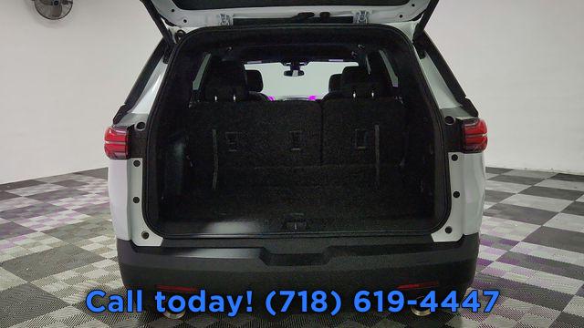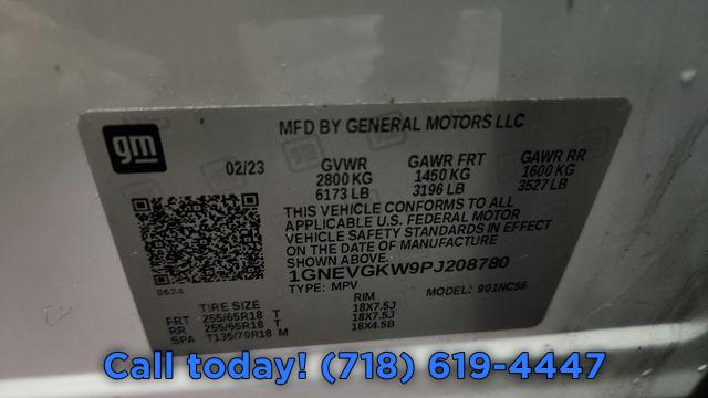 Front License Plate Bracket Mounting Package, Preferred Equipment Group 1LT, 6 Speakers, 6-Speaker Audio System Feature, AM/FM radio: SiriusXM, Radio data system, Radio: Chevrolet Infotainment 3 Plus System, SiriusXM w/360L, Air Conditioning, Automatic temperature control, Front dual zone A/C, Rear air conditioning, Rear window defroster, 8-Way Power Driver Seat Adjuster, Power driver seat, Power steering, Power windows, Remote keyless entry, Steering wheel mounted audio controls, Four wheel independent suspension, Speed-sensing steering, Traction control, 4-Wheel Disc Brakes, ABS brakes, Dual front impact airbags, Dual front side impact airbags, Emergency communication system, Front anti-roll bar, Low tire pressure warning, Occupant sensing airbag, Overhead airbag, Rear anti-roll bar, Power Liftgate, Brake assist, Electronic Stability Control, Exterior Parking Camera Rear, Auto High-beam Headlights, Delay-off headlights, Fully automatic headlights, Panic alarm, Security system, Speed control, Bumpers: body-color, Heated door mirrors, Power door mirrors, Spoiler, Turn signal indicator mirrors, Apple CarPlay/Android Auto, Compass, Driver door bin, Driver vanity mirror, Front reading lights, Garage door transmitter, Illuminated entry, Leather steering wheel, Not Equipped w/Rear Park Assist (060), Outside temperature display, Overhead console, Passenger vanity mirror, Premium Cloth Seat Trim, Rear reading lights, Tachometer, Telescoping steering wheel, Tilt steering wheel, Trip computer, Voltmeter, 2-Way Manual Front Passenger Seat Adjuster, 3rd row seats: split-bench, Front Bucket Seats, Front Center Armrest, Heated Driver & Front Passenger Seats, Heated front seats, Power Driver Lumbar Control, Black Roof Rails, Passenger door bin, Alloy wheels, Wheels: 18" Bright Silver-Painted Aluminum, Rear window wiper, Variably intermittent wipers, 3.49 Axle Ratio