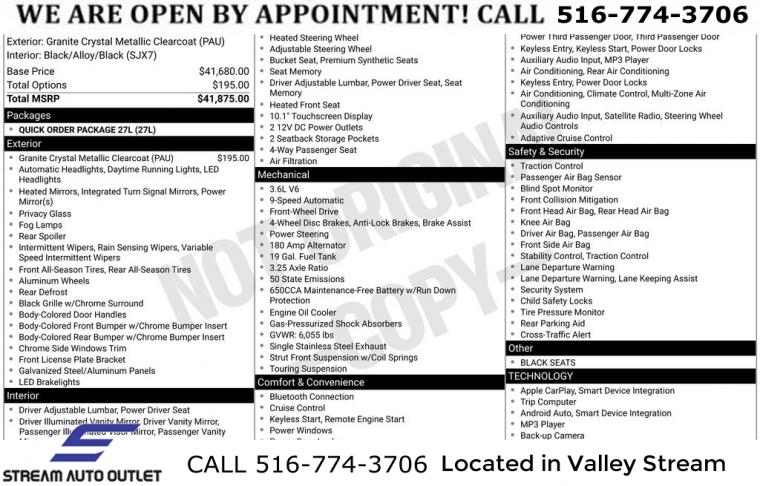 Quick Order Package 27L, 6 Speakers, AM/FM radio: SiriusXM, Audio memory, GPS Antenna Input, Integrated Active Noise Cancellation, Integrated Center Stack Radio, Radio data system, Radio: Uconnect 5 w/10.1" Display, Air Conditioning, Automatic temperature control, Front dual zone A/C, Rear air conditioning, Rear window defroster, Memory seat, Power driver seat, Power steering, Power windows, Remote keyless entry, Steering wheel mounted audio controls, Four wheel independent suspension, Traction control, 4-Wheel Disc Brakes, ABS brakes, Dual front impact airbags, Dual front side impact airbags, Front anti-roll bar, Knee airbag, Low tire pressure warning, Occupant sensing airbag, Overhead airbag, Power Liftgate, Brake assist, Electronic Stability Control, ParkView Rear Back-Up Camera, Delay-off headlights, Front fog lights, Fully automatic headlights, Panic alarm, Security system, Speed control, Bumpers: body-color, Front Fascia Air Deflectors, Heated door mirrors, Power door mirrors, Spoiler, Touring Suspension, Turn signal indicator mirrors, 10.1" Touchscreen Display, Apple CarPlay, Apple CarPlay/Android Auto, Caprice Leatherette Bucket Seats, Compass, Disassociated Touchscreen Display, Driver door bin, Driver vanity mirror, Front reading lights, Google Android Auto, Heated steering wheel, Illuminated entry, Outside temperature display, Overhead console, Passenger seat mounted armrest, Passenger vanity mirror, Rear reading lights, Tachometer, Telescoping steering wheel, Tilt steering wheel, Trip computer, USB Host Flip, Voltmeter, 3rd row seats: split-bench, Black Seats, Driver's Seat Mounted Armrest, Front Bucket Seats, Heated front seats, Reclining 3rd row seat, Split folding rear seat, Passenger door bin, 17" x 7.0" Aluminum Wheels, Alloy wheels, Rain sensing wipers, Rear window wiper, Variably intermittent wipers, 3.25 Axle Ratio, * NYS INSPECTION INCLUDED *, * FULL INTERIOR / EXTERIOR DETAIL *, * BLUETOOTH *, * LIMITED NYS LEMON LAW WARRANTY INCLUDED *, *FRESH OIL CHANGE *, * 150 MULTI POINT INSPECTION *