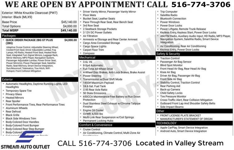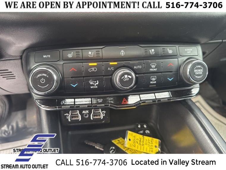 GPS Navigation, Quick Order Package 2BG GT Plus, 6 Speakers, AM/FM radio: SiriusXM, GPS Antenna Input, HD Radio, Integrated Center Stack Radio, Integrated Voice Command w/Bluetooth, Radio data system, Radio: Uconnect 4 w/8.4" Display, Radio: Uconnect 5 Nav w/10.1" Display, SiriusXM Radio Service, SiriusXM Satellite Radio, SiriusXM w/360L, Air Conditioning, Automatic temperature control, Front dual zone A/C, Rear air conditioning, Rear window defroster, Exterior Mirrors w/Memory, Heated Second Row Seats, Power driver seat, Power steering, Power windows, Radio/Driver Seat/Mirrors Memory, Remote keyless entry, Steering wheel mounted audio controls, Four wheel independent suspension, Rear Load Leveling Suspension, Speed-sensing steering, Traction control, 4-Wheel Disc Brakes, ABS brakes, Dual front impact airbags, Dual front side impact airbags, Front anti-roll bar, Knee airbag, Low tire pressure warning, Occupant sensing airbag, Overhead airbag, Rear anti-roll bar, Power Sunroof, Power Liftgate, Brake assist, Electronic Stability Control, ParkView Rear Back-Up Camera, Delay-off headlights, Fully automatic headlights, Panic alarm, Adaptive Cruise Control w/Stop, Speed control, 180 Amp Alternator, Heavy-Duty Engine Cooling, Auto-Dimming Exterior Driver Mirror, Bumpers: body-color, Exterior Mirrors w/Heating Element, Exterior Mirrors w/Supplemental Signals, Front License Plate Bracket, Gloss Black Exterior Mirrors, Heated door mirrors, Manufacturer's Statement of Origin, Power 6x9 Multi-Function Foldaway Mirrors, Power door mirrors, Premium LED Fog Lamps, Spoiler, 1-Year Trial (Registration Required), 10.1" Touchscreen Display, 115V Auxiliary Power Outlet, 4G LTE Wi-Fi Hot Spot, Apple CarPlay, Apple CarPlay/Android Auto, Auto-dimming Rear-View mirror, Cloth Bucket Seats w/Shift Insert, Compass, Connected Travel & Traffic Services, Disassociated Touchscreen Display, Driver door bin, Driver vanity mirror, Dual Remote USB Port - Charge Only, Front reading lights, Full Speed Forward Collision Warning Plus, Garage door transmitter, Google Android Auto, Heated steering wheel, Illuminated entry, Leather steering wheel, Leather Wrapped Door Panels, LED Auxiliary Low Beam & Turn Signal, Outside temperature display, Overhead console, Passenger vanity mirror, Power Tilt & Telescopic Steering Column, Rear reading lights, Rear seat center armrest, Red Accent Stitching, SiriusXM Guardian - Included Trial (B), Sport steering wheel, Tachometer, Telescoping steering wheel, Tilt steering wheel, Trip computer, USB Host Flip, Voltmeter, 3rd row seats: split-bench, Front Bucket Seats, Heated front seats, Leather Trimmed Bucket Seats, Power 8-Way Driver Memory 8-Way Passenger Seats, Power Driver/Passenger 4-Way Lumbar Adjust, Split folding rear seat, Ventilated Front Seats, Black Roof Rails, Floor Console w/Leather Armrest, Front Center Armrest w/Storage, Integrated Roof Rail Crossbars, Passenger door bin, 7 & 4 Pin Wiring Harness, Class IV Receiver Hitch, Trailer Brake Control, Alloy wheels, Wheels: 20" x 8.0" Fine Silver, Rear window wiper, Speed-Sensitive Wipers, Variably intermittent wipers, 3.45 Rear Axle Ratio, * NYS INSPECTION INCLUDED *, * FULL INTERIOR / EXTERIOR DETAIL *, * BACK UP CAMERA *, * NAVIGATION SYSTEM *, * BLUETOOTH *, * SUNROOF / MOONROOF*, * LEATHER SEATS *, * LIMITED NYS LEMON LAW WARRANTY INCLUDED *, *FRESH OIL CHANGE *, * 150 MULTI POINT INSPECTION *, APPLE CAR PLAY/ANDROID AUTO