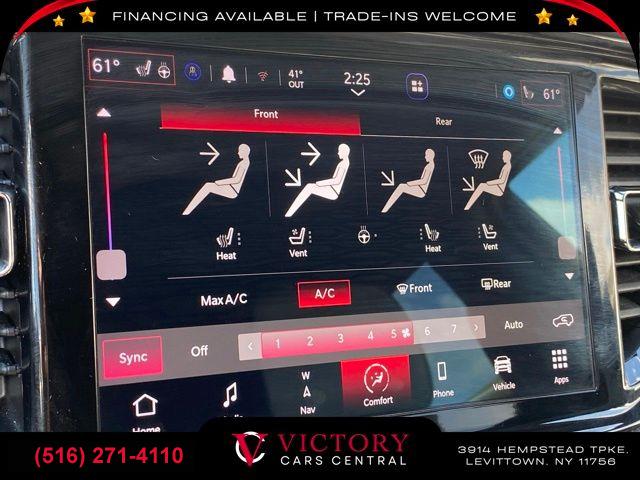 GPS Navigation, Quick Order Package 2BG GT Plus, 6 Speakers, AM/FM radio: SiriusXM, GPS Antenna Input, HD Radio, Integrated Center Stack Radio, Integrated Voice Command w/Bluetooth, Radio data system, Radio: Uconnect 4 w/8.4" Display, Radio: Uconnect 5 Nav w/10.1" Display, SiriusXM Radio Service, SiriusXM Satellite Radio, SiriusXM w/360L, Air Conditioning, Automatic temperature control, Front dual zone A/C, Rear air conditioning, Rear window defroster, Exterior Mirrors w/Memory, Heated Second Row Seats, Power driver seat, Power steering, Power windows, Radio/Driver Seat/Mirrors Memory, Remote keyless entry, Steering wheel mounted audio controls, Four wheel independent suspension, Rear Load Leveling Suspension, Speed-sensing steering, Traction control, 4-Wheel Disc Brakes, ABS brakes, Dual front impact airbags, Dual front side impact airbags, Front anti-roll bar, Knee airbag, Low tire pressure warning, Occupant sensing airbag, Overhead airbag, Rear anti-roll bar, Power Sunroof, Power Liftgate, Brake assist, Electronic Stability Control, ParkView Rear Back-Up Camera, Delay-off headlights, Fully automatic headlights, Panic alarm, Adaptive Cruise Control w/Stop, Speed control, 180 Amp Alternator, Heavy-Duty Engine Cooling, Auto-Dimming Exterior Driver Mirror, Bumpers: body-color, Exterior Mirrors w/Heating Element, Exterior Mirrors w/Supplemental Signals, Front License Plate Bracket, Gloss Black Exterior Mirrors, Heated door mirrors, Manufacturer's Statement of Origin, Power 6x9 Multi-Function Foldaway Mirrors, Power door mirrors, Premium LED Fog Lamps, Spoiler, 1-Year Trial (Registration Required), 10.1" Touchscreen Display, 115V Auxiliary Power Outlet, 4G LTE Wi-Fi Hot Spot, Apple CarPlay, Apple CarPlay/Android Auto, Auto-dimming Rear-View mirror, Cloth Bucket Seats w/Shift Insert, Compass, Connected Travel & Traffic Services, Disassociated Touchscreen Display, Driver door bin, Driver vanity mirror, Dual Remote USB Port - Charge Only, Front reading lights, Full Speed Forward Collision Warning Plus, Garage door transmitter, Google Android Auto, Heated steering wheel, Illuminated entry, Leather steering wheel, Leather Wrapped Door Panels, LED Auxiliary Low Beam & Turn Signal, Outside temperature display, Overhead console, Passenger vanity mirror, Power Tilt & Telescopic Steering Column, Rear reading lights, Rear seat center armrest, Red Accent Stitching, SiriusXM Guardian - Included Trial (B), Sport steering wheel, Tachometer, Telescoping steering wheel, Tilt steering wheel, Trip computer, USB Host Flip, Voltmeter, 3rd row seats: split-bench, Front Bucket Seats, Heated front seats, Leather Trimmed Bucket Seats, Power 8-Way Driver Memory 8-Way Passenger Seats, Power Driver/Passenger 4-Way Lumbar Adjust, Split folding rear seat, Ventilated Front Seats, Black Roof Rails, Floor Console w/Leather Armrest, Front Center Armrest w/Storage, Integrated Roof Rail Crossbars, Passenger door bin, 7 & 4 Pin Wiring Harness, Class IV Receiver Hitch, Trailer Brake Control, Alloy wheels, Wheels: 20" x 8.0" Fine Silver, Rear window wiper, Speed-Sensitive Wipers, Variably intermittent wipers, 3.45 Rear Axle Ratio