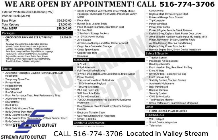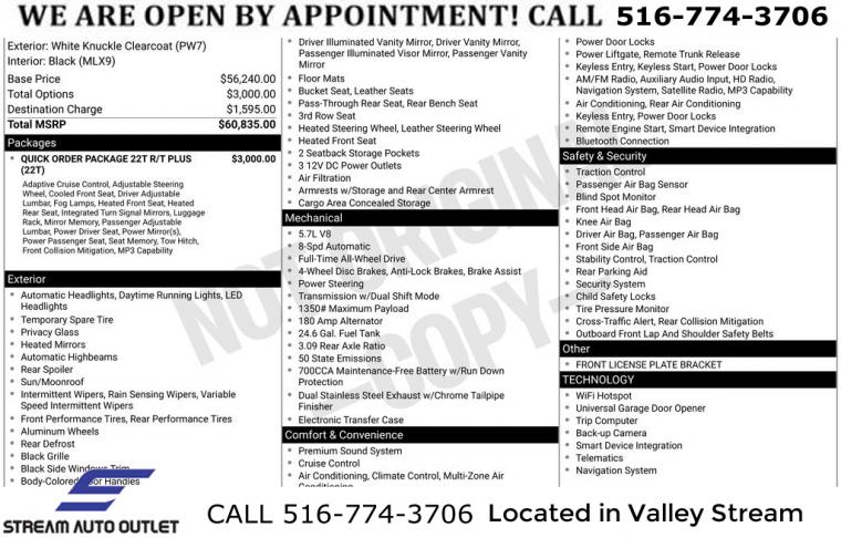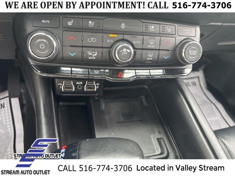 Navigation system: TomTom, Quick Order Package 22T R/T Plus, 9 Speakers, AM/FM radio: SiriusXM w/360L, Radio data system, Radio: Uconnect 5 Nav w/10.1" Display, Air Conditioning, Automatic temperature control, Front dual zone A/C, Rear air conditioning, Rear window defroster, Exterior Mirrors w/Memory, Heated Second Row Seats, Power driver seat, Power steering, Power windows, Radio/Driver Seat/Mirrors Memory, Remote keyless entry, Steering wheel mounted audio controls, Auto-leveling suspension, Four wheel independent suspension, Rear Load Leveling Suspension, Speed-sensing steering, Traction control, 4-Wheel Disc Brakes, ABS brakes, Anti-whiplash front head restraints, Dual front impact airbags, Dual front side impact airbags, Emergency communication system: SiriusXM Guardian, Front anti-roll bar, Knee airbag, Low tire pressure warning, Occupant sensing airbag, Overhead airbag, Rear anti-roll bar, Power Sunroof, Power Liftgate, Brake assist, Electronic Stability Control, ParkView Rear Back-Up Camera, Auto High-beam Headlights, Delay-off headlights, Fully automatic headlights, Panic alarm, Security system, Adaptive Cruise Control w/Stop, Speed control, Auto-Dimming Exterior Driver Mirror, Bumpers: body-color, Exterior Mirrors w/Heating Element, Exterior Mirrors w/Supplemental Signals, Front License Plate Bracket, Gloss Black Exterior Mirrors, Heated door mirrors, Power 6x9 Multi-Function Foldaway Mirrors, Power door mirrors, Premium LED Fog Lamps, Spoiler, 115V Auxiliary Power Outlet, Apple CarPlay/Android Auto, Auto-dimming Rear-View mirror, Cloth Bucket Seats w/Shift Insert, Compass, Driver door bin, Driver vanity mirror, Dual Remote USB Port - Charge Only, Front reading lights, Full Speed Forward Collision Warning Plus, Garage door transmitter, Heated steering wheel, Illuminated entry, Leather steering wheel, Leather Wrapped Door Panels, LED Auxiliary Low Beam & Turn Signal, Outside temperature display, Overhead console, Passenger vanity mirror, Power Tilt & Telescopic Steering Column, Rear reading lights, Rear seat center armrest, Red Accent Stitching, Sport steering wheel, Tachometer, Telescoping steering wheel, Tilt steering wheel, Trip computer, Voltmeter, 3rd row seats: split-bench, Front Bucket Seats, Heated front seats, Leather Trimmed Bucket Seats, Power 8-Way Driver Memory 8-Way Passenger Seats, Power Driver/Passenger 4-Way Lumbar Adjust, Split folding rear seat, Ventilated Front Seats, Black Roof Rails, Floor Console w/Leather Armrest, Front Center Armrest w/Storage, Integrated Roof Rail Crossbars, Passenger door bin, 7 & 4 Pin Wiring Harness, Class IV Receiver Hitch, Trailer Brake Control, Alloy wheels, Wheels: 20" x 8.0" Fine Silver, Rain sensing wipers, Rear window wiper, Speed-Sensitive Wipers, Variably intermittent wipers, 3.09 Rear Axle Ratio, * NYS INSPECTION INCLUDED *, * FULL INTERIOR / EXTERIOR DETAIL *, * BLUETOOTH *, * LIMITED NYS LEMON LAW WARRANTY INCLUDED *, *FRESH OIL CHANGE *, * 150 MULTI POINT INSPECTION *