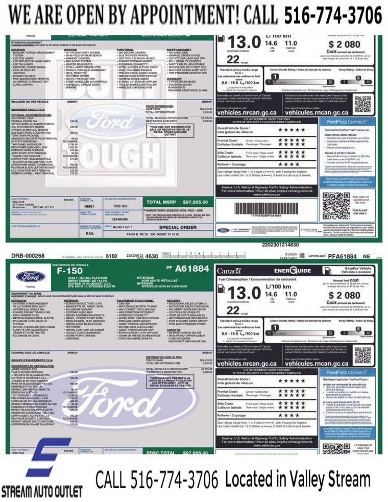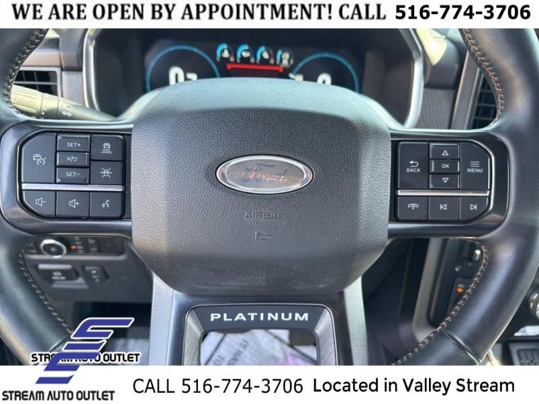 * NYS INSPECTION INCLUDED *, * FULL INTERIOR / EXTERIOR DETAIL *, * BACK UP CAMERA *, * NAVIGATION SYSTEM *, * BLUETOOTH *, * SUNROOF / MOONROOF*, * LEATHER SEATS *, * LIMITED NYS LEMON LAW WARRANTY INCLUDED *, *FRESH OIL CHANGE *, * 150 MULTI POINT INSPECTION *, APPLE CAR PLAY/ANDROID AUTO, F-150 Platinum, 4D SuperCrew, 3.5L V6 EcoBoost, 10-Speed Automatic, 4WD, Agate Black Metallic, Black w/Leather-Trimmed Bucket Seats, 360 Degree Camera, ABS brakes, Alloy wheels, Bed Utility Package, Compass, Electronic Stability Control, Equipment Group 701A High, Ford BlueCruise 1.0, Front dual zone A/C, Heated door mirrors, Heated front seats, Heated rear seats, Illuminated entry, Integrated Trailer Brake Controller, Interior Work Surface, Low tire pressure warning, Navigation System, Pro Power Onboard - 2KW, Pro Trailer Backup Assist & Pro Trailer Hitch Assist, Radio: B&O Unleashed Sound System by Bang & Olufsen, Remote keyless entry, Traction control, Twin Panel Moonroof.