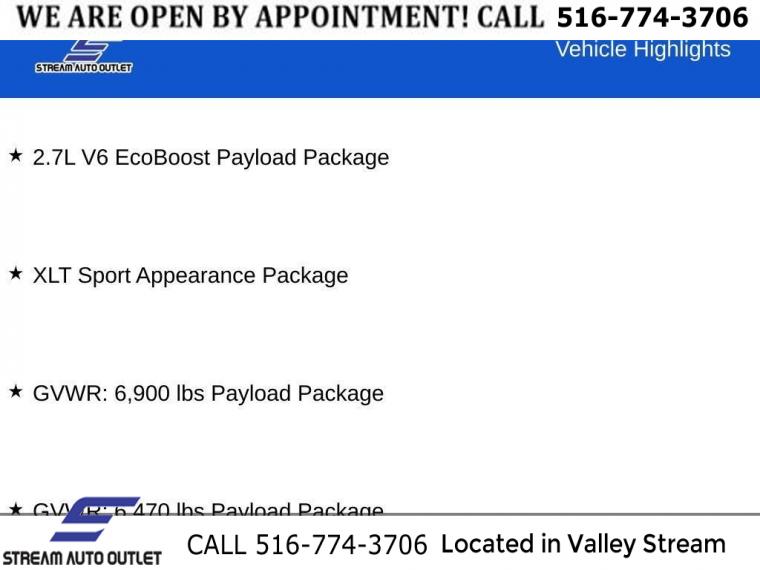 2.7L V6 EcoBoost Payload Package, GVWR: 6, 470 lbs Payload Package, GVWR: 6, 900 lbs Payload Package, XLT Sport Appearance Package, 6 Speakers, AM/FM radio, Radio data system, Radio: AM/FM Stereo w/6 Speakers, Air Conditioning, Rear window defroster, Power steering, Power windows, Remote keyless entry, Steering wheel mounted audio controls, Speed-sensing steering, Traction control, 4-Wheel Disc Brakes, ABS brakes, Body-Color Front & Rear Bumpers, Dual front impact airbags, Dual front side impact airbags, Emergency communication system: SYNC 4 911 Assist, Front anti-roll bar, Front wheel independent suspension, Low tire pressure warning, Occupant sensing airbag, Overhead airbag, Brake assist, Electronic Stability Control, Exterior Parking Camera Rear, Auto High-beam Headlights, Delay-off headlights, Front fog lights, Fully automatic headlights, Panic alarm, Security system, Speed control, Accent-Color Step Bars, Black 2-Bar Style Grille w/Black Surround/Accents, Body-Color Door & Tailgate Handles, Box Side Decals, Bumpers: chrome, Heated door mirrors, Power door mirrors, Rear step bumper, Compass, Driver door bin, Driver vanity mirror, Front reading lights, Illuminated entry, Outside temperature display, Overhead console, Passenger vanity mirror, Rear reading lights, SYNC 4, Tachometer, Telescoping steering wheel, Tilt steering wheel, Trip computer, Unique Sport Cloth 40/Console/40 Front-Seats, Voltmeter, Cloth 40/20/40 Front Seat, Split folding rear seat, Front Center Armrest w/Storage, Passenger door bin, Alloy wheels, Wheels: 17" Silver Painted Aluminum, Wheels: 18" 6-Spoke Machined Aluminum, Variably intermittent wipers, Electronic Locking w/3.73 Axle Ratio
