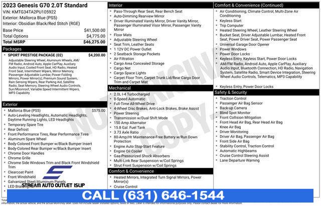 For more information on this 2023 Genesis G70, please call Stream Auto Outlet Islip at (631) 646-1544 or with the contact form on this page. This vehicle's vin number is KMTG34TA2PU105922 and is recorded as being in stock at Stream Auto Outlet Islip at 2232 Sunrise Hwy in Islip. See all cars from this dealership.