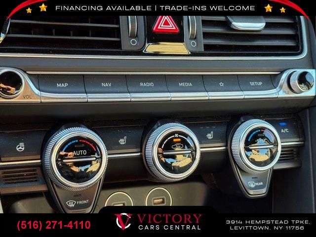 • Navigation System, Option Group 01, 6 Speakers, AM/FM radio: SiriusXM, Radio: AM/FM/SiriusXM/HD Audio System, Air Conditioning, Automatic temperature control, Front dual zone A/C, Rear window defroster, Power driver seat, Power steering, Power windows, Remote keyless entry, Steering wheel mounted audio controls, Four wheel independent suspension, Traction control, 4-Wheel Disc Brakes, ABS brakes, Anti-whiplash front head restraints, Dual front impact airbags, Dual front side impact airbags, Emergency communication system: Genesis Connected Services, Front anti-roll bar, Knee airbag, Low tire pressure warning, Occupant sensing airbag, Overhead airbag, Rear anti-roll bar, Brake assist, Electronic Stability Control, Exterior Parking Camera Rear, Auto High-beam Headlights, Delay-off headlights, Fully automatic headlights, Panic alarm, Security system, Speed control, Bumpers: body-color, Heated door mirrors, Power door mirrors, Turn signal indicator mirrors, Android Auto & Apple CarPlay, Auto-dimming Rear-View mirror, Driver door bin, Driver vanity mirror, Front reading lights, Garage door transmitter: HomeLink, Heated Multi-Adjustable Front Bucket Seats, Heated steering wheel, Illuminated entry, Outside temperature display, Overhead console, Passenger vanity mirror, Rear reading lights, Rear seat center armrest, Tachometer, Telescoping steering wheel, Trip computer, Front Bucket Seats, Front Center Armrest, Heated front seats, Leatherette Seating Surfaces, Power passenger seat, Split folding rear seat, Passenger door bin, Alloy wheels, Wheels: 19" x 8.0J Fr & 19" x 8.5J Rr Alloy, Speed-Sensitive Wipers, Variably intermittent wipers