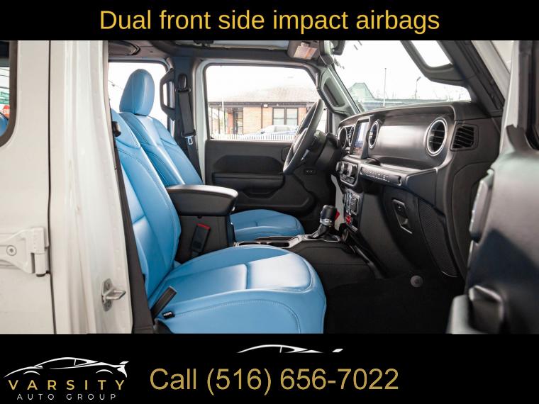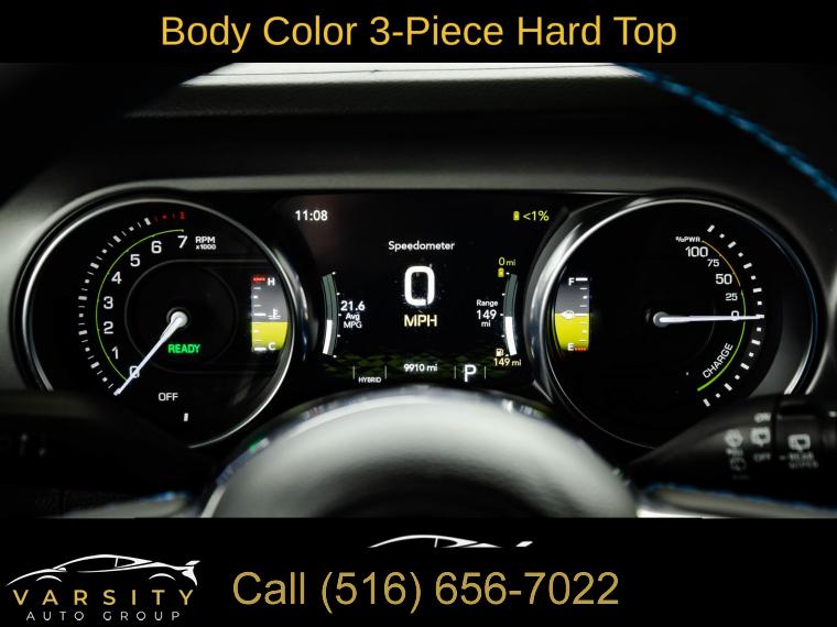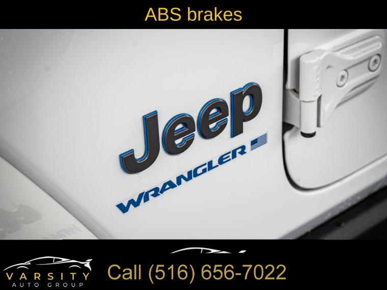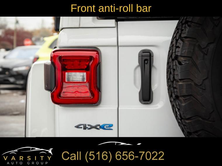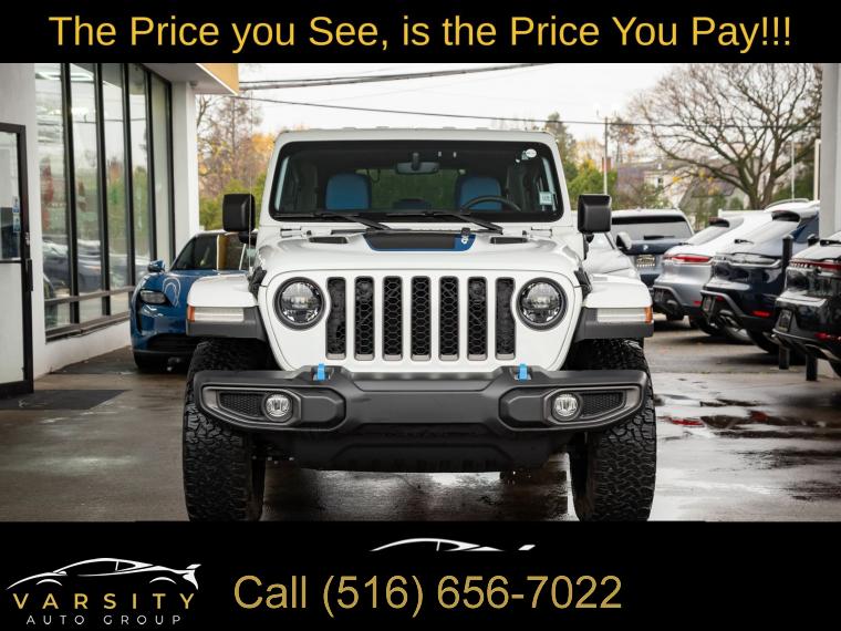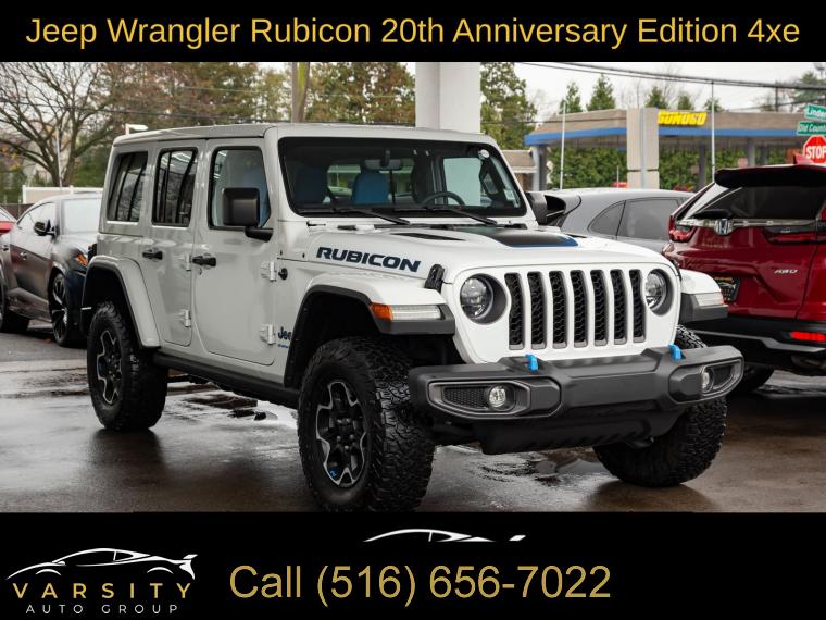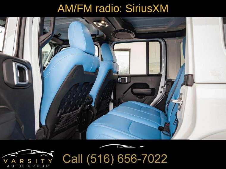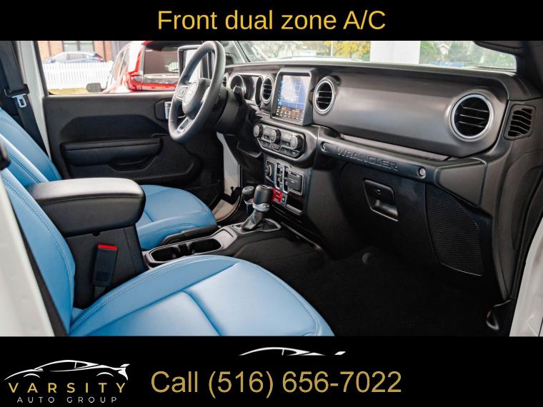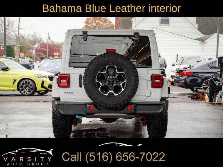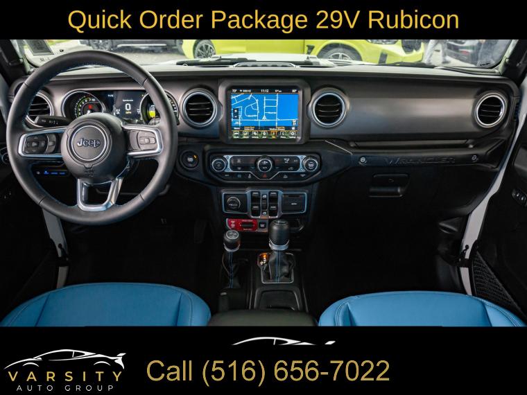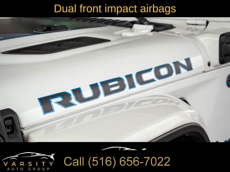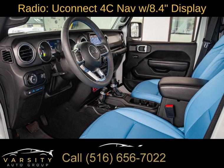 Navigation System, Quick Order Package 29V Rubicon, Body Color 3-Piece Hard Top, 9 Speakers, AM/FM radio: SiriusXM, Radio data system, Radio: Uconnect 4C Nav w/8.4" Display, Air Conditioning, Automatic temperature control, Front dual zone A/C, Rear Window Defroster, Power steering, Power windows, Remote keyless entry, Steering wheel mounted audio controls, Performance Suspension, Traction control, 4-Wheel Disc Brakes, ABS brakes, Dual front impact airbags, Dual front side impact airbags, Emergency communication system: SiriusXM Guardian, Front anti-roll bar, Integrated roll-over protection, Low tire pressure warning, Occupant sensing airbag, Rear anti-roll bar, Brake assist, Electronic Stability Control, ParkView Rear Back-Up Camera, Delay-off headlights, Front fog lights, Fully automatic headlights, Panic alarm, Security system, Speed control, Body Color Rubicon Highline Flare, Heated door mirrors, Power door mirrors, Apple CarPlay/Android Auto, Auto-dimming Rear-View mirror, Compass, Driver door bin, Driver vanity mirror, Front reading lights, Garage door transmitter, Illuminated entry, Outside temperature display, Passenger vanity mirror, Rear reading lights, Tachometer, Telescoping steering wheel, Tilt steering wheel, Trip computer, Voltmeter, Front Bucket Seats, Premium Cloth Low-Back Bucket Seats, Split folding rear seat, Freedom Panel Storage Bag, Front Center Armrest w/Storage, Passenger door bin, Alloy wheels, Wheels: 17" x 7.5" Machined w/Black Pockets, Rear Window Wiper/Washer, Variably intermittent wipers, 4.10 Rear Axle Ratio, The Price you See, is the Price You Pay!!!, Jeep Wrangler Rubicon 20th Anniversary Edition 4xe, Bright White Clearcoat, Bahama Blue Leather interior