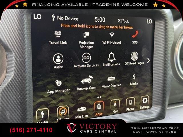 Navigation System, Quick Order Package 22G Sahara, 9 Speakers, AM/FM radio: SiriusXM, Radio data system, Radio: Uconnect 4C Nav w/8.4" Display, Air Conditioning, Automatic temperature control, Front dual zone A/C, Power steering, Power windows, Remote keyless entry, Steering wheel mounted audio controls, Heavy Duty Suspension w/Gas Shocks, Traction control, 4-Wheel Disc Brakes, ABS brakes, Dual front impact airbags, Dual front side impact airbags, Emergency communication system: SiriusXM Guardian, Front anti-roll bar, Integrated roll-over protection, Low tire pressure warning, Occupant sensing airbag, Rear anti-roll bar, Brake assist, Electronic Stability Control, ParkView Rear Back-Up Camera, Side Steps, Delay-off headlights, Front fog lights, Fully automatic headlights, Panic alarm, Security system, Speed control, Aux Battery, Stop-Start Dual Battery System, Black 3-Piece Hard Top, Front License Plate Bracket, Heated door mirrors, No Soft Top, Non-Lock Fuel Cap w/o Discriminator, Power door mirrors, Apple CarPlay/Android Auto, Auto-dimming Rear-View mirror, Compass, Driver door bin, Driver vanity mirror, Front reading lights, Garage door transmitter, Illuminated entry, Outside temperature display, Passenger vanity mirror, Rear reading lights, Tachometer, Telescoping steering wheel, Tilt steering wheel, Trip computer, Voltmeter, Cloth Low-Back Bucket Seats, Front Bucket Seats, Split folding rear seat, Freedom Panel Storage Bag, Front Center Armrest w/Storage, Passenger door bin, Alloy wheels, Wheels: 18" x 7.5" Machined w/Gray Spokes, Variably intermittent wipers, 3.45 Overall Top Gear Ratio