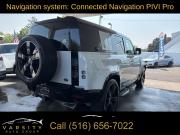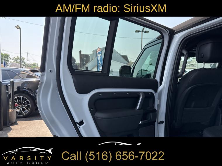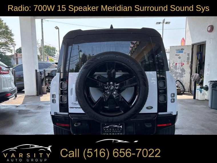 ONE OWNER, 14-Way Heated & Cooled Electric Memory Seats, 15 Speakers, 3.55 Axle Ratio, 4-Wheel Disc Brakes, ABS brakes, Active Cruise Control, Adaptive suspension, Air Conditioning, Alloy wheels, AM/FM radio: SiriusXM, Apple CarPlay & Android Auto, Auto High-beam Headlights, Auto tilt-away steering wheel, Auto-dimming door mirrors, Auto-dimming Rear-View mirror, Automatic temperature control, Brake assist, Bumpers: body-color, Compass, Delay-off headlights, Driver door bin, Driver vanity mirror, Dual front impact airbags, Dual front side impact airbags, Electronic Stability Control, Exterior Parking Camera Rear, Four wheel independent suspension, Front anti-roll bar, Front Bucket Seats, Front Center Armrest, Front dual zone A/C, Front fog lights, Front reading lights, Fully automatic headlights, Headlight cleaning, Heads-Up Display, Heated door mirrors, Heated front seats, Heated rear seats, Heated steering wheel, Illuminated entry, Leather Shift Knob, Low tire pressure warning, Memory seat, Navigation System, Navigation system: Connected Navigation PIVI Pro, Occupant sensing airbag, Outside temperature display, Overhead airbag, Overhead console, Panic alarm, Passenger door bin, Passenger vanity mirror, Power door mirrors, Power driver seat, Power moonroof, Power passenger seat, Power steering, Power windows, Radio data system, Radio: 700W 15 Speaker Meridian Surround Sound Sys, Rain sensing wipers, Rear air conditioning, Rear anti-roll bar, Rear fog lights, Rear reading lights, Rear seat center armrest, Rear window defroster, Rear window wiper, Remote keyless entry, Security system, Speed control, Speed-sensing steering, Speed-Sensitive Wipers, Split folding rear seat, Steering wheel memory, Steering wheel mounted audio controls, Tachometer, Telescoping steering wheel, Tilt steering wheel, Traction control, Trip computer, Variably intermittent wipers, Ventilated front seats, Weather band radio, Wheels: 22" Gloss Dark Grey Style 5098, Windsor Leather Seat Trim. White 2023 Land Rover Defender 110 V8 4WD 8-Speed Automatic 5.0L V8