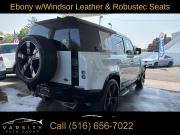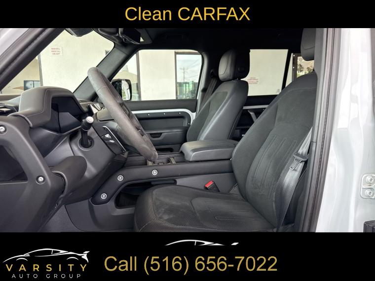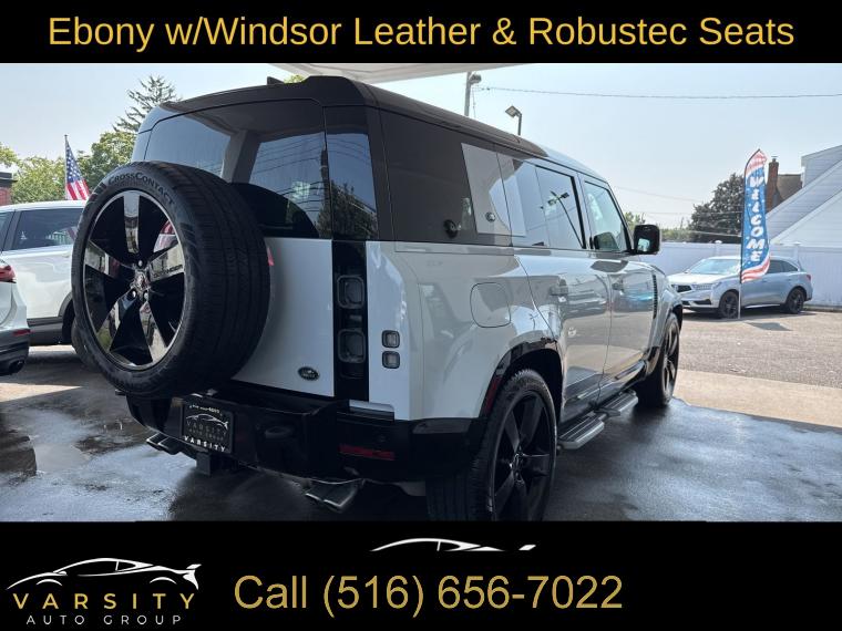 2023 Land Rover Defender 110, Fuji White, Ebony w/Windsor Leather & Robustec Seats, 5.0L V8, 4WD, 1 Owner, Clean CARFAX, 14-Way Heated & Cooled Electric Memory Seats, 15 Speakers, 3.55 Axle Ratio, 4-Wheel Disc Brakes, ABS brakes, Active Cruise Control, Adaptive suspension, Air Conditioning, Alloy wheels, AM/FM radio: SiriusXM, Apple CarPlay & Android Auto, Auto High-beam Headlights, Auto tilt-away steering wheel, Auto-dimming door mirrors, Auto-dimming Rear-View mirror, Automatic temperature control, Brake assist, Bumpers: body-color, Compass, Delay-off headlights, Driver door bin, Driver vanity mirror, Dual front impact airbags, Dual front side impact airbags, Electronic Stability Control, Exterior Parking Camera Rear, Four wheel independent suspension, Front anti-roll bar, Front Bucket Seats, Front Center Armrest, Front dual zone A/C, Front fog lights, Front reading lights, Fully automatic headlights, Garage door transmitter: HomeLink, Headlight cleaning, Heads-Up Display, Heated door mirrors, Heated front seats, Heated rear seats, Heated steering wheel, Illuminated entry, Leather Shift Knob, Low tire pressure warning, Memory seat, Navigation System, Navigation system: Connected Navigation PIVI Pro, Occupant sensing airbag, Outside temperature display, Overhead airbag, Overhead console, Panic alarm, Passenger door bin, Passenger vanity mirror, Power door mirrors, Power driver seat, Power moonroof, Power passenger seat, Power steering, Power windows, Radio data system, Radio: 700W 15 Speaker Meridian Surround Sound Sys, Rain sensing wipers, Rear air conditioning, Rear anti-roll bar, Rear fog lights, Rear reading lights, Rear seat center armrest, Rear window defroster, Rear window wiper, Remote keyless entry, Security system, Speed control, Speed-sensing steering, Speed-Sensitive Wipers, Split folding rear seat, Steering wheel memory, Steering wheel mounted audio controls, Tachometer, Telescoping steering wheel, Tilt steering wheel, Traction control, Trip computer, Variably intermittent wipers, Ventilated front seats, Weather band radio, Wheels: 22" Gloss Dark Grey Style 5098, Windsor Leather Seat Trim. Fuji White 2023 Land Rover Defender 110 V8 4WD 8-Speed Automatic 5.0L V8