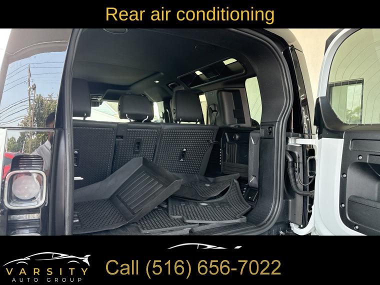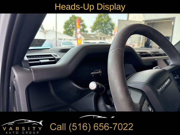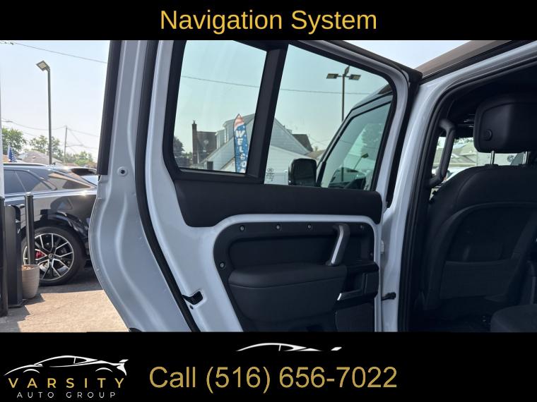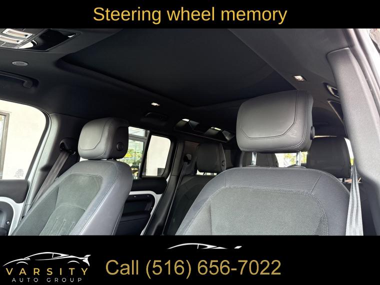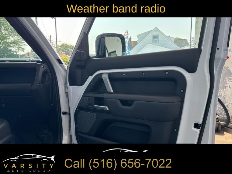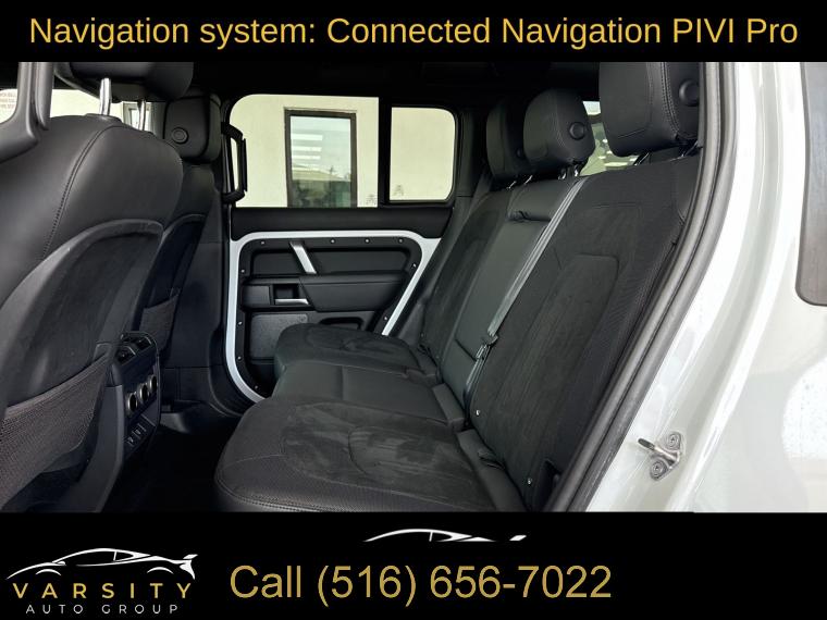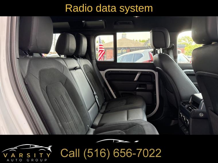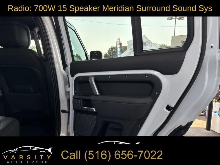 Navigation System, Navigation system: Connected Navigation PIVI Pro, 15 Speakers, AM/FM radio: SiriusXM, Radio data system, Radio: 700W 15 Speaker Meridian Surround Sound Sys, Weather band radio, Air Conditioning, Automatic temperature control, Front dual zone A/C, Rear air conditioning, Rear window defroster, Heads-Up Display, Memory seat, Power driver seat, Power steering, Power windows, Remote keyless entry, Steering wheel memory, Steering wheel mounted audio controls, Adaptive suspension, Four wheel independent suspension, Speed-sensing steering, Traction control, 4-Wheel Disc Brakes, ABS brakes, Dual front impact airbags, Dual front side impact airbags, Front anti-roll bar, Low tire pressure warning, Occupant sensing airbag, Overhead airbag, Rear anti-roll bar, Power moonroof, Brake assist, Electronic Stability Control, Exterior Parking Camera Rear, Auto High-beam Headlights, Delay-off headlights, Front fog lights, Fully automatic headlights, Headlight cleaning, Rear fog lights, Panic alarm, Security system, Active Cruise Control, Speed control, Auto-dimming door mirrors, Bumpers: body-color, Heated door mirrors, Power door mirrors, 14-Way Heated & Cooled Electric Memory Seats, Apple CarPlay & Android Auto, Auto tilt-away steering wheel, Auto-dimming Rear-View mirror, Compass, Driver door bin, Driver vanity mirror, Front reading lights, Garage door transmitter: HomeLink, Heated steering wheel, Illuminated entry, Leather Shift Knob, Outside temperature display, Overhead console, Passenger vanity mirror, Rear reading lights, Rear seat center armrest, Tachometer, Telescoping steering wheel, Tilt steering wheel, Trip computer, Front Bucket Seats, Front Center Armrest, Heated front seats, Heated rear seats, Power passenger seat, Split folding rear seat, Ventilated front seats, Windsor Leather Seat Trim, Passenger door bin, Alloy wheels, Wheels: 22" Gloss Dark Grey Style 5098, Rain sensing wipers, Rear window wiper, Speed-Sensitive Wipers, Variably intermittent wipers, 3.55 Axle Ratio, 2023 Land Rover Defender 110, Fuji White, Ebony w/Windsor Leather & Robustec Seats, 5.0L V8, 4WD, 1 Owner, Clean CARFAX