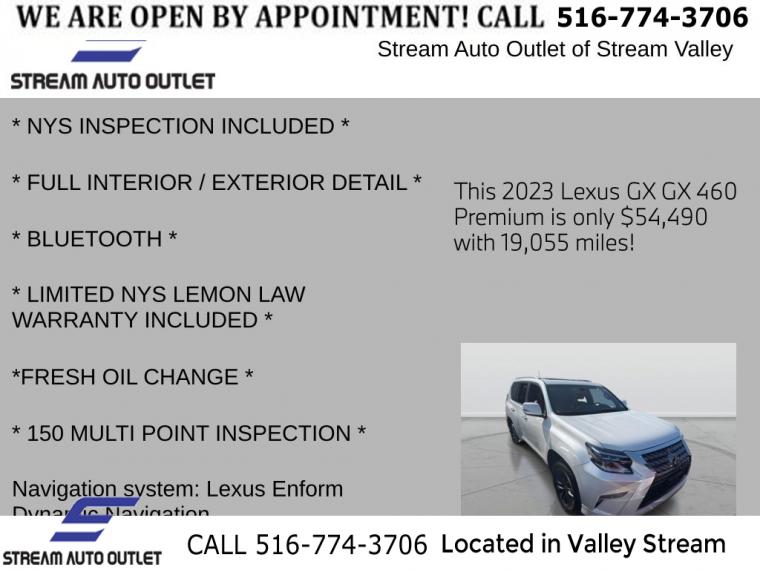 For more information on this 2023 Lexus GX, please call Stream Auto Outlet Valley Stream at (516) 774-3706 or with the contact form on this page. This vehicle's vin number is JTJAM7BX4P5363407 and is recorded as being in stock at Stream Auto Outlet Valley Stream at 324 W Merrick Rd in Valley Stream. See all cars from this dealership.