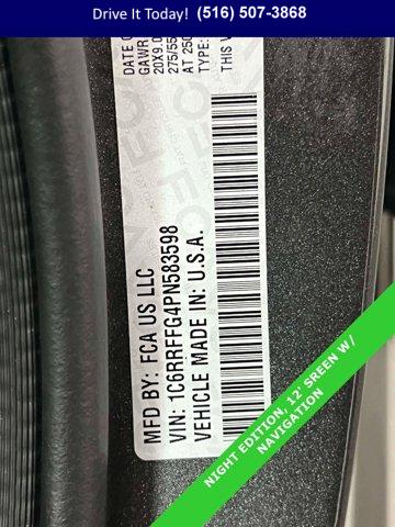 GVWR: 6 900 LBS (STD), BLACK DELUXE CLOTH BUCKET SEATS -inc: Power 8-Way Driver Seat Center Console Parts Module Bucket Seats Manual Adjust 4-Way Front Passenger Seat Full Length Floor Console Rear Center Armrest Power 2-Way Driver Lumbar Adjust, MONOTONE PAINT, TRANSMISSION: 8-SPEED AUTOMATIC (850RE) (STD), PARKSENSE FRONT/REAR PARK ASSIST W/STOP, 9 AMPLIFIED SPEAKERS W/SUBWOOFER, QUICK ORDER PACKAGE 23Z BIG HORN -inc: Engine: 3.6L V6 24V VVT eTorque UPG I Transmission: 8-Speed Automatic (850RE) Big Horn Badge, BIG HORN LEVEL B EQUIPMENT GROUP -inc: SiriusXM Radio Service Rear Window Defroster ParkSense Front/Rear Park Assist w/Stop Rear View Auto Dim Mirror Power Adjustable Pedals Rear Power Sliding Window Rear Dome w/On/Off Switch Lamp Front Fog Lamps Glove Box Lamp Media Hub w/2 Charge Only USBs Power 8-Way Driver Seat Auto Dim Exterior Driver Mirror Heated Front Seats Heated Steering Wheel Class IV Receiver Hitch Security Alarm Black Premium Power Mirrors Big Horn IP Badge Remote Start System SiriusXM Satellite Radio 400W Inverter 9 Amplified Speakers w/Subwoofer Radio: Uconnect 5 Nav w/12.0 Display Google Android Auto USB Host Flip Disassociated Touchscreen Display HD Radio Integrated Center Stack Radio For More Info Call 800-643-2112 Connectivity - US/Canada 12 Touchscreen Display GPS Navigation 4G LTE Wi-Fi Hot Spot SiriusXM w/360L All Radio Equipped Vehicles Connected Travel & Traffic Services All R1 High Radios Apple CarPlay Exterior Mirrors, 115V AUXILIARY POWER OUTLET, ENGINE: 3.6L V6 24V VVT ETORQUE UPG I (STD), MOPAR FRONT & REAR RUBBER FLOOR MATS, REMOTE START SYSTEM, TIRES: 275/55R20 OWL ALL SEASON -inc: Bridgestone Brand Tires, NIGHT EDITION -inc: Tires: 275/55R20 OWL All Season Bridgestone Brand Tires Accent Color Premium Power Mirrors Exterior Mirrors w/Supplemental Signals Black Headlamp Bezels Exterior Mirrors Courtesy Lamps Auto Dim Exterior Driver Mirror Black Exterior Truck Badging Anti-Spin Differential Rear Axle Wheels: 20 x 9.0 Premium Paint/Polished Accent Color Door Handles Black Interior Accents Dual Exhaust w/Black Tips Power-Folding Mirrors Body Color Front Bumper Body Color Rear Bumper w/Step Pads RAM Grille Badge - Black Black Painted Exterior Mirrors Caps, PREMIUM LIGHTING GROUP -inc: Front LED Fog Lamps LED Reflector Headlamps LED Taillamps, WHEELS: 20 X 9.0 PREMIUM PAINT/POLISHED, RADIO: UCONNECT 5 NAV W/12.0 DISPLAY -inc: Google Android Auto USB Host Flip Disassociated Touchscreen Display HD Radio Integrated Center Stack Radio For More Info Call 800-643-2112 Connectivity - US/Canada 12 Touchscreen Display GPS Navigation 4G LTE Wi-Fi Hot Spot SiriusXM w/360L All Radio Equipped Vehicles Connected Travel & Traffic Services All R1 High Radios Apple CarPlay, 3.21 REAR AXLE RATIO (STD), FRONT LICENSE PLATE BRACKET, ANTI-SPIN DIFFERENTIAL REAR AXLE, GRANITE CRYSTAL METALLIC CLEARCOAT