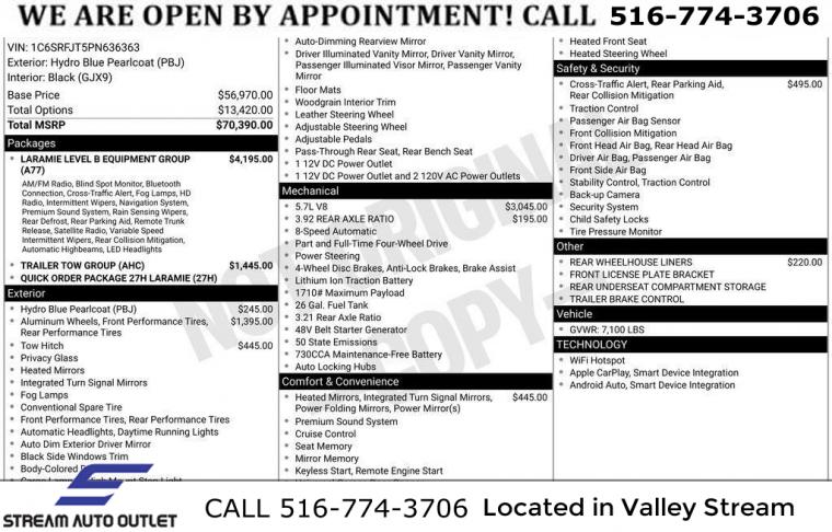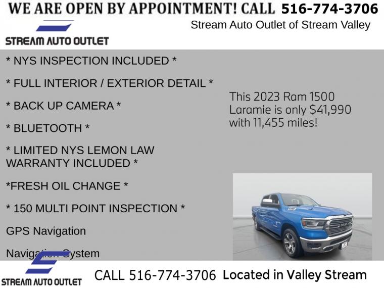 For more information on this 2023 RAM 1500, please call Stream Auto Outlet Valley Stream at (516) 774-3706 or with the contact form on this page. This vehicle's vin number is 1C6SRFJT5PN636363 and is recorded as being in stock at Stream Auto Outlet Valley Stream at 324 W Merrick Rd in Valley Stream. See all cars from this dealership.