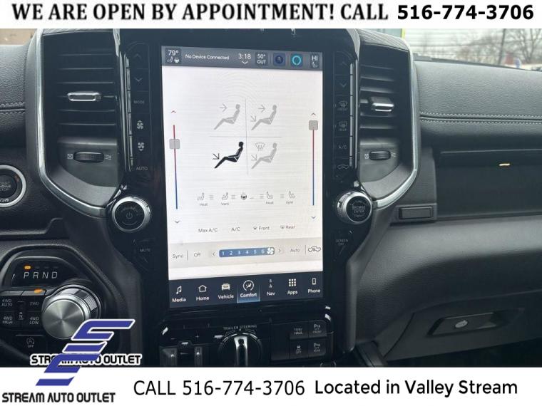 • GPS Navigation, Navigation System, Laramie Level B Equipment Group, Quick Order Package 27H Laramie, Trailer Tow Group, 10 Speakers, AM/FM radio: SiriusXM with 360L, Audio memory, GPS Antenna Input, harman/kardon 19 Speaker Premium Sound, HD Radio, Integrated Center Stack Radio, Radio data system, Radio: Uconnect 5 Nav w/12.0" Display, Radio: Uconnect 5 Nav w/8.4" Display, SiriusXM Radio Service, SiriusXM w/360L, Air Conditioning, Automatic temperature control, Front dual zone A/C, Rear Window Defroster, Driver Seat Memory, Exterior Mirrors w/Memory, Memory seat, Pedal memory, Power driver seat, Power steering, Power windows, Rear 60/40 Folding Seat, Rear Power Sliding Window, Remote keyless entry, Steering wheel mounted audio controls, Traction control, 4-Wheel Disc Brakes, ABS brakes, Dual front impact airbags, Dual front side impact airbags, Front anti-roll bar, Front wheel independent suspension, Low tire pressure warning, Occupant sensing airbag, Overhead airbag, Rear anti-roll bar, Remote Tailgate Release, Blind Spot & Cross Path Detection, Brake assist, Electronic Stability Control, ParkView Rear Back-Up Camera, Delay-off headlights, Front fog lights, Fully automatic headlights, Panic alarm, Security system, Speed control, Electric Shift-On-Demand Transfer Case, 48V Belt Starter Generator, Auto High Beam Headlamp Control, Auto-dimming door mirrors, Auto-Dimming Exterior Driver Mirror, Bumpers: chrome, Chrome Exterior Mirrors, Chrome Power-Fold Trailer Tow Mirrors (DISC), Convex Wide-Angle Exterior Mirror Insert, Exterior Mirrors Courtesy Lamps, Exterior Mirrors w/Heating Element, Exterior Mirrors w/Supplemental Signals, For More Info, Call 800-643-2112, Front LED Fog Lamps, Front License Plate Bracket, Heated door mirrors, LED Reflector Headlamps, Mirror Clearance/Running Lights, Mirror-Mounted Aux Reverse Lamps, Power door mirrors, Power-Folding Mirrors, RAM Grille Badge - Chrome, Rear step bumper, Rear Wheelhouse Liners, Trailer Tow Mirrors, Turn signal indicator mirrors, USB Host Flip, #1 Seat Foam Cushion, 12" Touchscreen Display, 2nd Row In Floor Storage Bins, 4G LTE Wi-Fi Hot Spot, Adjustable pedals, Apple CarPlay, Apple CarPlay/Android Auto, Auto-dimming Rear-View mirror, Compass, Connected Travel & Traffic Services, Connectivity - US/Canada, Disassociated Touchscreen Display, Driver door bin, Driver vanity mirror, Foam Bottle Insert (Door Trim Panel), For Details, Visit DriveUconnect.com, Front Door Accent Lighting, Front reading lights, Garage door transmitter, Global Telematics Box Module (TBM), Google Android Auto, Heated Steering Wheel, Heated steering wheel, Illuminated entry, Integrated Voice Command w/Bluetooth, Leather steering wheel, Outside temperature display, Overhead console, ParkSense Front/Rear Park Assist w/Stop, ParkSense Front/Rear Park Assist w/Stop (DISC), Passenger vanity mirror, Rear Door Accent Lighting, Rear seat center armrest, Tachometer, Telescoping steering wheel, Tilt steering wheel, Trip computer, Voltmeter, 3 Rear Seat Head Restraints, 4 Way Front Headrests, Heated Front Seats, Heated front seats, Leather Trim 40/20/40 Bench Seat, Power 2-Way Driver Lumbar Adjust, Power 2-Way Passenger Lumbar Adjust, Power 8-Way Driver & Passenger Seats, Power passenger seat, Split folding rear seat, Ventilated Front Seats, Ventilated front seats, Front Center Armrest w/Storage, Front Seat Back Map Pockets, Passenger door bin, Rear Underseat Compartment Storage, Class IV Receiver Hitch, Trailer Brake Control, Trailer Light Check, Trailer Reverse Steering Control, Trailer Tire Pressure Monitoring System, Alloy wheels, Wheels: 18" x 8" Aluminum Base Painted, Wheels: 20" x 9" Premium Paint/Polished, Rain Sensitive Windshield Wipers, Variably intermittent wipers, 3.21 Rear Axle Ratio, 3.92 Rear Axle Ratio, * NYS INSPECTION INCLUDED *, * FULL INTERIOR / EXTERIOR DETAIL *, * BACK UP CAMERA *, * BLUETOOTH *, * LIMITED NYS LEMON LAW WARRANTY INCLUDED *, *FRESH OIL CHANGE *, * 150 MULTI POINT INSPECTION *