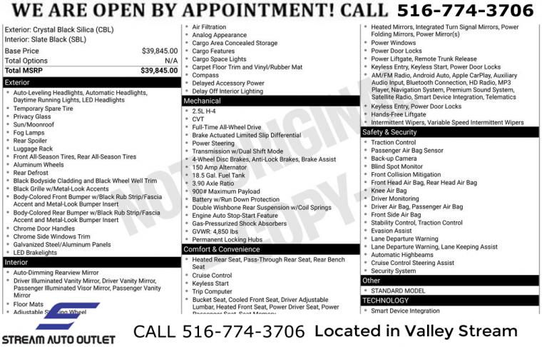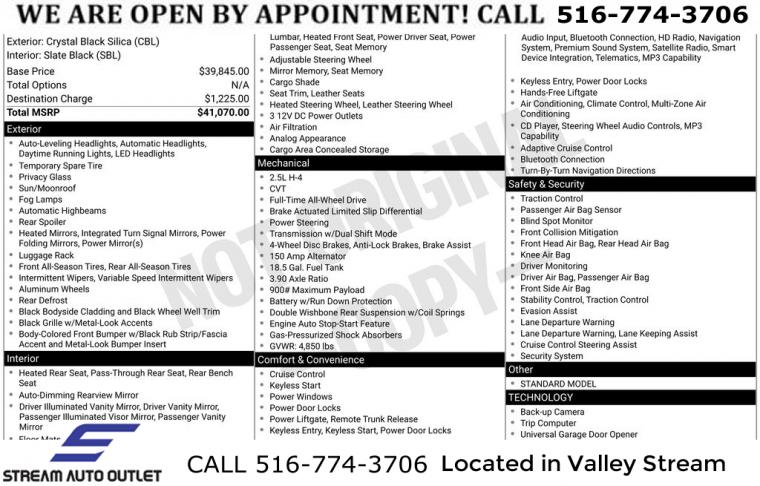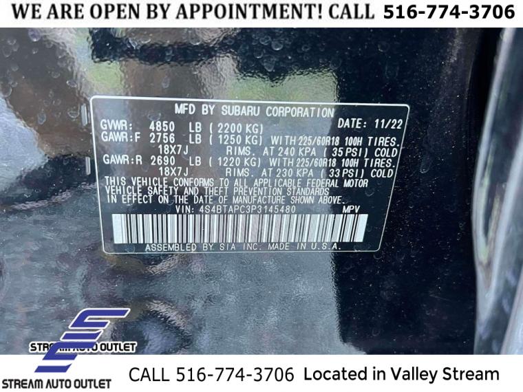 Navigation System, Standard Model, 12 Speakers, AM/FM radio: SiriusXM, harman/kardonĀ® Speakers, Radio: Subaru STARLINK 11.6" Multimedia Nav System, Remote CD player, Air Conditioning, Automatic temperature control, Front dual zone A/C, HVAC memory, Rear window defroster, Memory seat, Power driver seat, Power steering, Power windows, Remote keyless entry, Steering wheel mounted audio controls, Four wheel independent suspension, Speed-sensing steering, Traction control, 4-Wheel Disc Brakes, ABS brakes, Dual front impact airbags, Dual front side impact airbags, Emergency communication system: STARLINK Safety Plus (3-year free trial), Front anti-roll bar, Knee airbag, Low tire pressure warning, Occupant sensing airbag, Overhead airbag, Rear anti-roll bar, Power moonroof, Power Liftgate, Brake assist, Electronic Stability Control, Exterior Parking Camera Rear, Auto High-beam Headlights, Front fog lights, Fully automatic headlights, Panic alarm, Security system, Speed control, Bumpers: body-color, Heated door mirrors, Power door mirrors, Roof rack, Spoiler, Steering Wheel Paddle Shift Control Switches, Turn signal indicator mirrors, Auto-dimming Rear-View mirror, Compass, Driver door bin, Driver vanity mirror, Front reading lights, Garage door transmitter: HomeLink, Heated steering wheel, Illuminated entry, Leather Shift Knob, Leather steering wheel, Outside temperature display, Overhead console, Passenger vanity mirror, Rear seat center armrest, Tachometer, Telescoping steering wheel, Tilt steering wheel, Trip computer, Front Bucket Seats, Heated & Ventilated Front Bucket Seats, Heated front seats, Heated rear seats, Perforated Nappa Leather-Trimmed Upholstery, Power passenger seat, Split folding rear seat, Ventilated front seats, Front Center Armrest w/Storage, Passenger door bin, Alloy wheels, Wheels: 18" x 7J Black Aluminum Alloy, Rear window wiper, Variably intermittent wipers, 3.90 Axle Ratio, * NYS INSPECTION INCLUDED *, * FULL INTERIOR / EXTERIOR DETAIL *, * BLUETOOTH *, * LIMITED NYS LEMON LAW WARRANTY INCLUDED *, *FRESH OIL CHANGE *, * 150 MULTI POINT INSPECTION *
