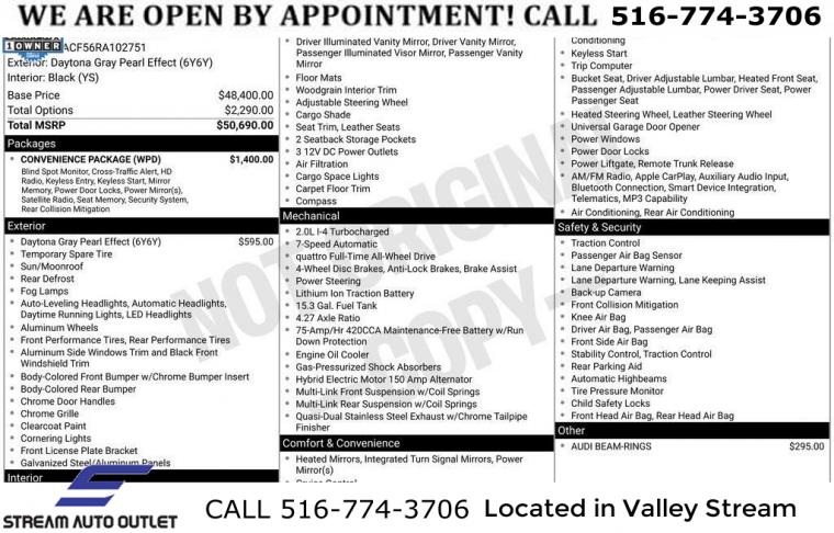 * NYS INSPECTION INCLUDED *, * FULL INTERIOR / EXTERIOR DETAIL *, * BACK UP CAMERA *, * BLUETOOTH *, * LEATHER SEATS *, * LIMITED NYS LEMON LAW WARRANTY INCLUDED *, *FRESH OIL CHANGE *, * 150 MULTI POINT INSPECTION *, APPLE CAR PLAY/ANDROID AUTO, Alarm System w/Motion Sensors, Audi Advanced Key, Audi Side Assist w/Pre Sense Rear, Auto-Dimming Exterior Mirrors w/Memory, Convenience Package, Driver Seat Memory, SiriusXM w/360L.