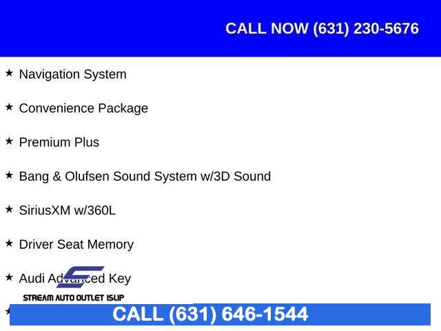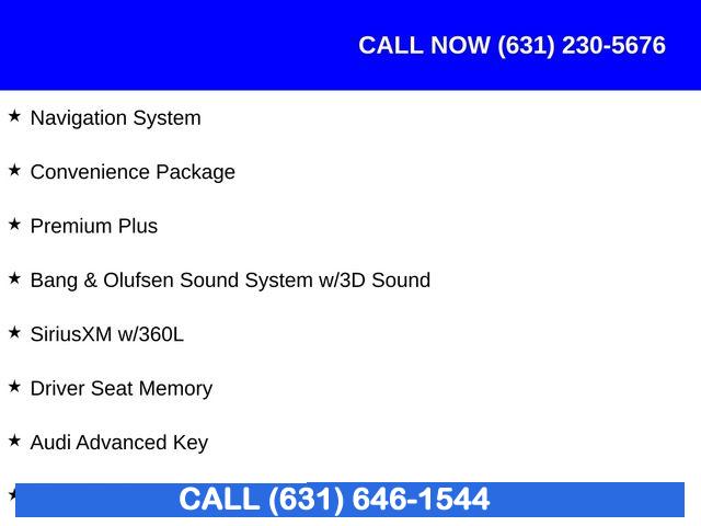Navigation System, Convenience Package, Premium Plus, 10 Speakers, AM/FM radio, Bang & Olufsen Sound System w/3D Sound, Radio data system, Radio: Audi Sound System, SiriusXM w/360L, Air Conditioning, Automatic temperature control, Front dual zone A/C, Rear air conditioning, Rear window defroster, Audi Advanced Key, Driver Seat Memory, Power driver seat, Power steering, Power windows, Remote keyless entry, Steering wheel mounted audio controls, Four wheel independent suspension, Speed-sensing steering, Traction control, 4-Wheel Disc Brakes, ABS brakes, Anti-whiplash front head restraints, Dual front impact airbags, Dual front side impact airbags, Emergency communication system: Audi connect CARE, Front anti-roll bar, Knee airbag, Low tire pressure warning, Occupant sensing airbag, Overhead airbag, Power adjustable front head restraints, Rear anti-roll bar, Power moonroof, Power Liftgate, Brake assist, Electronic Stability Control, Exterior Parking Camera Rear, Auto High-beam Headlights, Delay-off headlights, Front fog lights, Alarm System w/Motion Sensors, Panic alarm, Speed control, Auto-Dimming Exterior Mirrors w/Memory, Bumpers: body-color, Heated door mirrors, Power door mirrors, Power Folding Exterior Mirrors, Turn signal indicator mirrors, 2 Rear USB Charge Ports, Audi Side Assist w/Pre Sense Rear, Audi Virtual Cockpit Plus, Auto-dimming Rear-View mirror, Compass, Driver door bin, Driver vanity mirror, Front reading lights, Garage door transmitter: HomeLink, Genuine wood console insert, Genuine wood dashboard insert, Genuine wood door panel insert, Heated steering wheel, Illuminated entry, Leather Shift Knob, Leather steering wheel, Leatherette Covered Center Console & Door Armrests, Outside temperature display, Overhead console, Passenger vanity mirror, Rear reading lights, Rear seat center armrest, Tachometer, Telescoping steering wheel, Tilt steering wheel, Top View Camera System, Trip computer, Wireless Phone Charging Pad, Front Bucket Seats, Front Center Armrest, Heated front seats, Heated Front Sport Seats, Leather Seating Surfaces, Power passenger seat, Split folding rear seat, Passenger door bin, Alloy wheels, Wheels: 18" 5-Double-Spoke Design, Rain sensing wipers, Speed-Sensitive Wipers, Variably intermittent wipers
