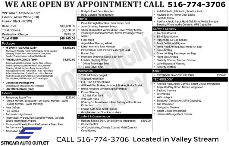 Navigation, Navigation System, Connected Package Pro, Lights Package, M Sport Package, M Sport Package (337), Premium Package, 10 Speakers, AM/FM radio: SiriusXM, Hi-Fi Sound System, Radio data system, Radio: AM/FM Audio System, Air Conditioning, Automatic temperature control, Front dual zone A/C, Rear window defroster, Comfort Access Keyless Entry, Head-Up Display, Lumbar Support, Memory seat, Power driver seat, Power steering, Power windows, Remote Engine Start, Remote keyless entry, Steering wheel mounted audio controls, Four wheel independent suspension, M Sport Steering, Speed-sensing steering, Traction control, 4-Wheel Disc Brakes, ABS brakes, Dual front impact airbags, Dual front side impact airbags, Emergency communication system: BMW Assist eCall, Front anti-roll bar, Knee airbag, Low tire pressure warning, Occupant sensing airbag, Overhead airbag, Rear anti-roll bar, Panoramic Moonroof, Brake assist, Electronic Stability Control, Exterior Parking Camera Rear, Auto High-beam Headlights, Delay-off headlights, Front fog lights, Fully automatic headlights, Panic alarm, Security system, Speed control, Adaptive Full LED Lights, Aerodynamic Kit, Auto-dimming door mirrors, Bumpers: body-color, Extended Shadowline Trim, Heated door mirrors, M Sport Suspension, Power door mirrors, Rear Spoiler, Shadowline Exterior Trim, Turn signal indicator mirrors, Without Lines Designation Outside, Apple CarPlay & Android Auto Compatibility, Apple CarPlay Compatibility, Auto-dimming Rear-View mirror, BMW Assist eCall, BMW TeleServices, Compass, ConnectedDrive Services, Driver door bin, Driver vanity mirror, Enhanced USB & Bluetooth, Front reading lights, Heated Steering Wheel, Illuminated entry, Large CID Screen, M Steering Wheel, Outside temperature display, Passenger vanity mirror, Rear reading lights, Rear seat center armrest, Sport steering wheel, Tachometer, Telescoping steering wheel, Tilt steering wheel, Trip computer, Universal Garage-Door Opener, WiFi Hotspot, Wireless Charging, Front Bucket Seats, Front Center Armrest, Heated Front Seats, Power Front Seats, Power passenger seat, SensaTec Upholstery, Split folding rear seat, Sport Seats, Passenger door bin, Alloy wheels, Wheels: 18" x 8.0" M Double-Spoke Bi-Color, Rain sensing wipers, Speed-Sensitive Wipers, Variably intermittent wipers, * NYS INSPECTION INCLUDED *, * FULL INTERIOR / EXTERIOR DETAIL *, * NAVIGATION SYSTEM *, * BLUETOOTH *, * LIMITED NYS LEMON LAW WARRANTY INCLUDED *, *FRESH OIL CHANGE *, * 150 MULTI POINT INSPECTION *, APPLE CAR PLAY/ANDROID AUTO