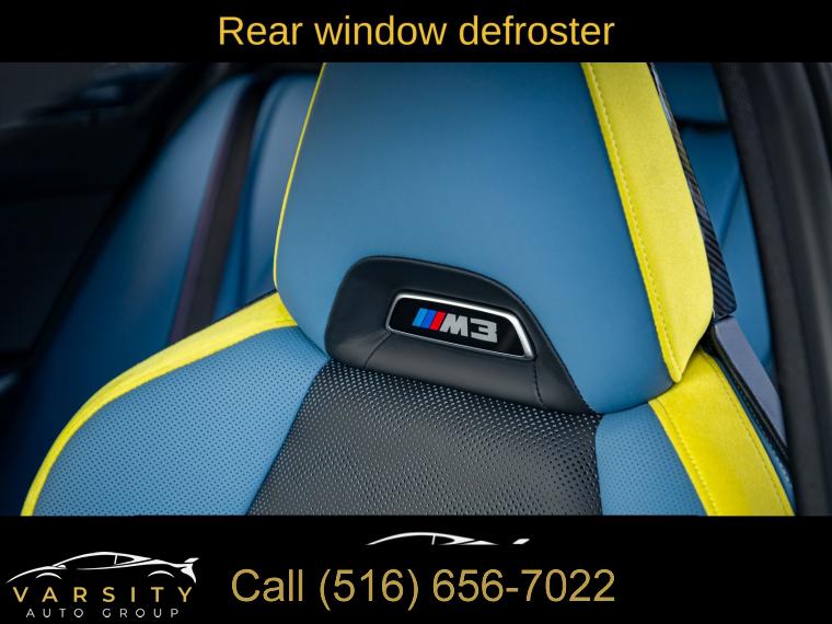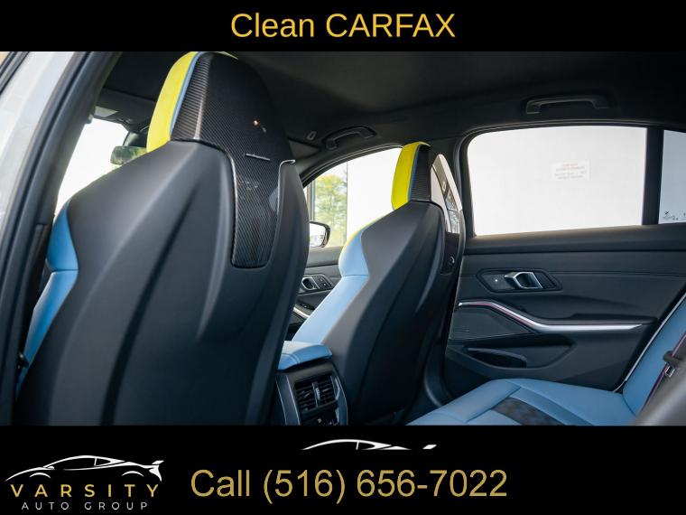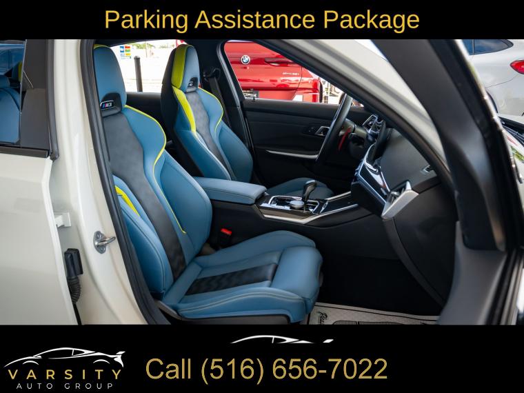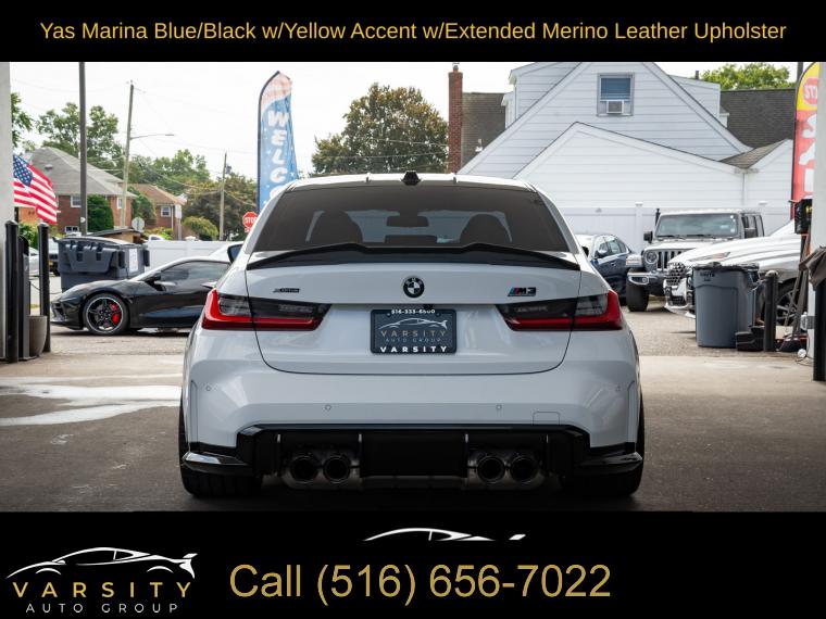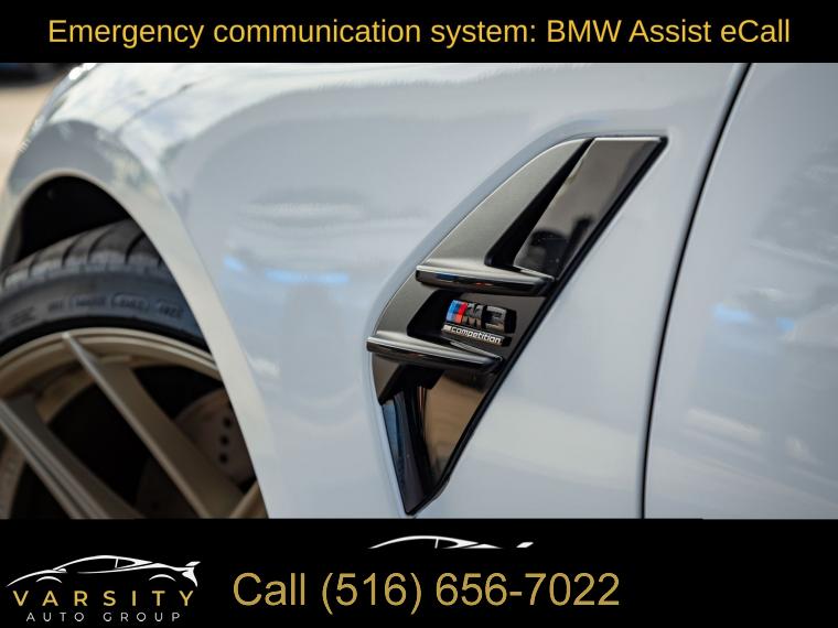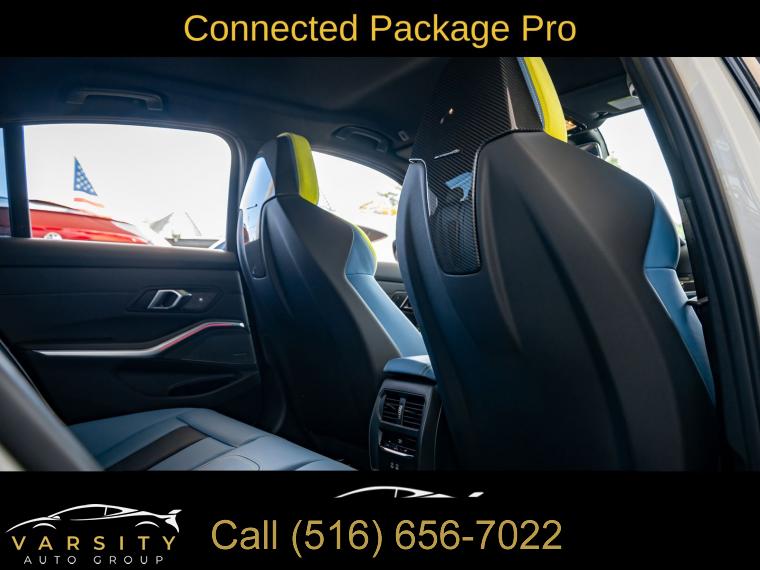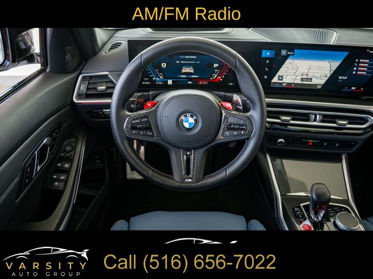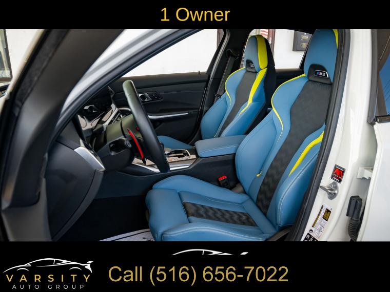 Navigation, Navigation System, Connected Package Pro, Executive Package, Parking Assistance Package, 16 Speakers, AM/FM Radio, AM/FM radio: SiriusXM, harman/kardon Surround Sound System, harman/kardonĀ® Speakers, Radio data system, SiriusXM w/360L & 1 Year Platinum Plan Subscription, Air Conditioning, Automatic temperature control, Front dual zone A/C, Rear air conditioning, Rear window defroster, Lumbar Support, Memory seat, Power driver seat, Power steering, Power windows, Remote Engine Start, Remote keyless entry, Steering wheel mounted audio controls, Adaptive suspension, Four wheel independent suspension, Speed-sensing steering, Traction control, 4-Wheel Disc Brakes, ABS brakes, Dual front impact airbags, Dual front side impact airbags, Emergency communication system: BMW Assist eCall, Front anti-roll bar, Knee airbag, Low tire pressure warning, M Compound Brakes w/Red Calipers, Occupant sensing airbag, Overhead airbag, Rear anti-roll bar, Power Tailgate, Brake assist, Electronic Stability Control, Exterior Parking Camera Rear, Auto High-beam Headlights, Delay-off headlights, Fully automatic headlights, Panic alarm, Security system, Speed control, Auto-dimming door mirrors, Bumpers: body-color, Heated door mirrors, M Shadowline Lights, Parking Assistant Plus, Power door mirrors, Spoiler, Turn signal indicator mirrors, Apple CarPlay & Android Auto Compatibility, Auto-dimming Rear-View mirror, BMW Assist eCall, BMW Curved Display w/HUD, BMW TeleServices, Carbon Fiber Trim, Compass, ConnectedDrive Services, Driver door bin, Driver vanity mirror, Front reading lights, Garage door transmitter, Heated Steering Wheel, Illuminated entry, Individual Piano Black Finish Trim, Leather Shift Knob, M Carbon Bucket Seats, Outside temperature display, Passenger vanity mirror, Rear reading lights, SensaTec Dashboard, Sport steering wheel, Tachometer, Telescoping steering wheel, Tilt steering wheel, Trip computer, Wireless Device Charging, Extended Merino Leather Upholstery, Front Bucket Seats, Front Center Armrest, Heated Front Seats, Heated front seats, M Sport Seats, Power Front Seats, Power passenger seat, Split folding rear seat, Passenger door bin, Alloy wheels, Wheels: 19"x9.5" Fr. & 20"x10.5" Rr M Black, Rain sensing wipers, Speed-Sensitive Wipers, Variably intermittent wipers, The Price you See, is the Price You Pay!!!, M3 Competition, Alpine White, Yas Marina Blue/Black w/Yellow Accent w/Extended Merino Leather Upholster, Edelweiss LT3 Wheels in Champange Finish, Michelin Pilot Sport 4 S tires, xDrive, 3.0L I6 Turbocharged DOHC 24V LEV3-ULEV70 543hp, 8-Speed Automatic Steptronic, 1 Owner, Clean CARFAX
