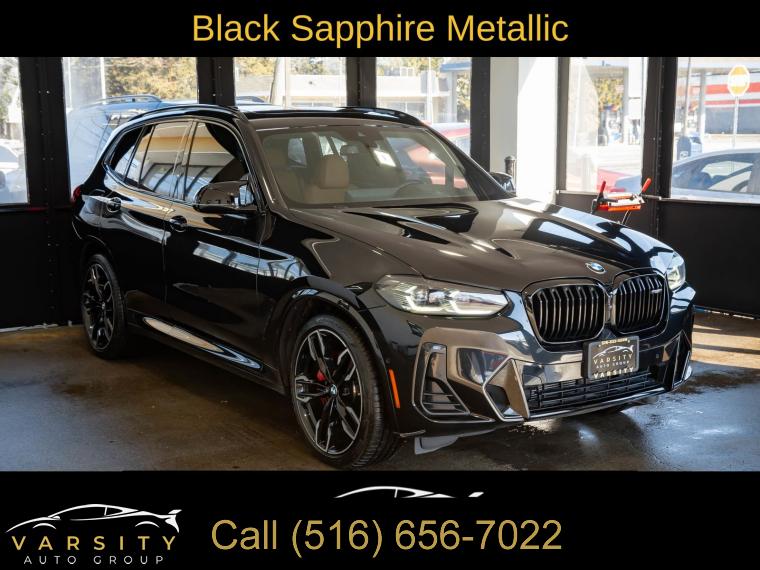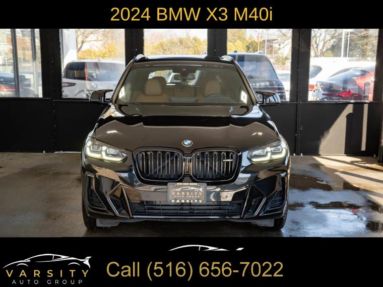 2024 BMW X3 M40i, Black Sapphire Metallic, Cognac w/Perforated SensaTec Upholstery, Premium Package, Shadowline Package, Clean CARFAX, 8-Speed Automatic Sport, 12 Speakers, 3.385 Axle Ratio, 4-Wheel Disc Brakes, ABS brakes, Active Park Distance Control, Adaptive suspension, Air Conditioning, Alloy wheels, AM/FM Radio, AM/FM radio: SiriusXM, Apple CarPlay & Android Auto Compatibility, Auto High-beam Headlights, Auto-dimming door mirrors, Auto-dimming Rear-View mirror, Automatic temperature control, BMW Assist eCall, BMW TeleServices, Brake assist, Bumpers: body-color, Carbon Fiber Trim, Connected Package Pro, ConnectedDrive Services, Delay-off headlights, Driver door bin, Driver vanity mirror, Dual front impact airbags, Dual front side impact airbags, Electronic Stability Control, Emergency communication system: BMW Assist eCall, Enhanced USB & Bluetooth w/Smartphone Integration, Extended Shadowline Trim, Exterior Parking Camera Rear, Four wheel independent suspension, Front & Rear Heated Seats, Front anti-roll bar, Front Bucket Seats, Front Center Armrest, Front dual zone A/C, Front reading lights, Fully automatic headlights, Garage door transmitter, harman/kardon Surround Sound System, Head-Up Display, Heated door mirrors, Heated Front Seats, Heated Steering Wheel, Hi-Fi Sound System, Illuminated entry, Increased Top Speed Limiter, Knee airbag, Leather steering wheel, Live Cockpit Pro w/Navigation, Low tire pressure warning, Lumbar Support, M Shadowline Lights, M Sport Brakes w/Red Calipers, Memory seat, Navigation System, Occupant sensing airbag, Outside temperature display, Overhead airbag, Overhead console, Panic alarm, Parking Assistance Package, Parking Assistant Plus, Passenger door bin, Passenger vanity mirror, Perforated SensaTec Upholstery, Power door mirrors, Power driver seat, Power Front Seats, Power Liftgate, Power moonroof, Power passenger seat, Power steering, Power windows, Premium Package, Radio data system, Rain sensing wipers, Rear air conditioning, Rear anti-roll bar, Rear reading lights, Rear seat center armrest, Rear window defroster, Rear window wiper, Rear-View Camera, Remote keyless entry, Security system, Shadowline Package, SiriusXM w/360L & 1 Yr Platinum Plan Subscription, Speed control, Speed-sensing steering, Speed-Sensitive Wipers, Split folding rear seat, Spoiler, Sport Seats, Sport steering wheel, Steering wheel mounted audio controls, Surround View w/3D View, Tachometer, Telescoping steering wheel, Tilt steering wheel, Traction control, Trip computer, Turn signal indicator mirrors, Variably intermittent wipers, Wheels: 19" x 7.5" M Y-Spoke Bi-Color (Style 887M), Wheels: 21" x 8.5" Fr & 21" x 9.5" Rr (Style 718M), WiFi Hotspot, Wireless Charging. Black Sapphire Metallic 2024 BMW X3 M40i AWD 8-Speed Automatic Sport I6 21/26 City/Highway MPG