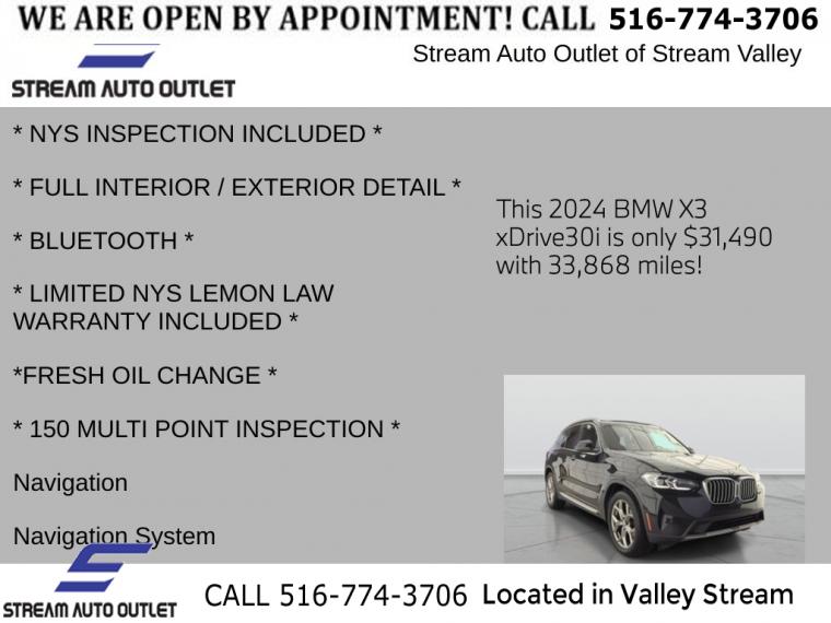 For more information on this 2024 BMW X3, please call Stream Auto Outlet Valley Stream at (516) 774-3706 or with the contact form on this page. This vehicle's vin number is 5UX53DP0XR9U58274 and is recorded as being in stock at Stream Auto Outlet Valley Stream at 324 W Merrick Rd in Valley Stream. See all cars from this dealership.