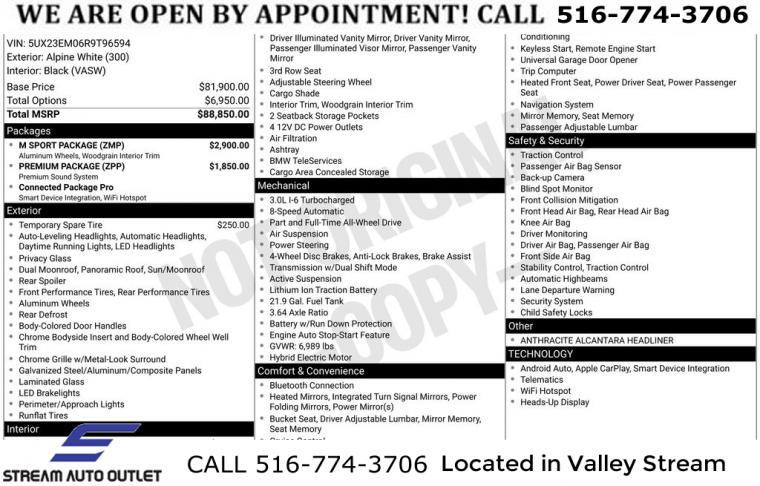 Navigation system: BMW Maps Navigation, Connected Package Pro, M Sport Package, M Sport Package (337), Premium Package, 10 Speakers, AM/FM radio: SiriusXM with 360L, AM/FM Stereo, harman/kardon Surround Sound System, Hi-Fi Sound System, Radio data system, SiriusXM w/360L & 1 Year Platinum Plan Subscription, Air Conditioning, Automatic temperature control, Front dual zone A/C, Rear air conditioning, Rear dual zone A/C, Rear window defroster, Head restraints memory, Heads-Up Display, Memory seat, Power driver seat, Power steering, Power windows, Remote keyless entry, Steering wheel memory, Steering wheel mounted audio controls, Adaptive suspension, Auto-leveling suspension, Four wheel independent suspension, Speed-sensing steering, Traction control, 4-Wheel Disc Brakes, ABS brakes, Dual front impact airbags, Dual front side impact airbags, Emergency communication system: BMW Assist eCall, Front anti-roll bar, Knee airbag, Low tire pressure warning, Occupant sensing airbag, Overhead airbag, Power adjustable front head restraints, Rear anti-roll bar, Power moonroof: Panorama, Soft-Close Automatic Doors, Brake assist, Electronic Stability Control, Exterior Parking Camera Rear, Auto High-beam Headlights, Delay-off headlights, Fully automatic headlights, Panic alarm, Security system, Speed control, Aerodynamic Kit, Auto-dimming door mirrors, Bumpers: body-color, Heated door mirrors, Power door mirrors, Shadowline Exterior Trim, Spoiler, Turn signal indicator mirrors, Without Lines Designation Outside, Anthracite Alcantara Headliner, Apple CarPlay & Android Auto Compatibility, Apple CarPlay Compatibility, Auto tilt-away steering wheel, Auto-dimming Rear-View mirror, BMW Assist eCall, BMW TeleServices, Compass, ConnectedDrive Services, Driver door bin, Driver vanity mirror, Front reading lights, Garage door transmitter, Genuine wood console insert, Genuine wood dashboard insert, Genuine wood door panel insert, Gesture Control, Heated Multi-Contour Seats, Heated steering wheel, Illuminated entry, Leather steering wheel, Live Cockpit Pro, M Steering Wheel, Outside temperature display, Passenger vanity mirror, Personal eSIM 5G, Rear reading lights, Rear seat center armrest, Sport steering wheel, Tachometer, Telescoping steering wheel, Tilt steering wheel, Trip computer, Wireless Charging Device, 3rd row seats: split-bench, Front Bucket Seats, Front Center Armrest, Heated front seats, Power Front Seats, Power passenger seat, Reclining 3rd row seat, Sensafin Upholstery, Split folding rear seat, Passenger door bin, Alloy wheels, Wheels: 21" x 9.5" Double-Spoke Bi-Color Orbit Grey, Wheels: 21" x 9.5" Y-Spoke Bi-Color, Rear Electric Side Window Shades, Rain sensing wipers, Rear window wiper, Speed-Sensitive Wipers, Variably intermittent wipers, 3.64 Axle Ratio, * NYS INSPECTION INCLUDED *, * FULL INTERIOR / EXTERIOR DETAIL *, * BLUETOOTH *, * LIMITED NYS LEMON LAW WARRANTY INCLUDED *, *FRESH OIL CHANGE *, * 150 MULTI POINT INSPECTION *