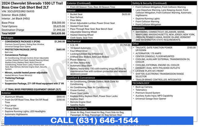 Convenience Package, Convenience Package II, Preferred Equipment Group 2LT, Protection Package, Suspension Package, Trailering Package, 2 USB Data Ports, 6 Speakers, 6-Speaker Audio System, AM/FM radio: SiriusXM with 360L, Dual Rear USB Ports (Charge Only), Premium audio system: Chevrolet Infotainment 3 Premium, Premium Bose 7-Speaker Sound System, Radio data system, Radio: Chevrolet Infotainment 3 Premium System, SiriusXM w/360L, Steering Wheel Audio Controls, Air Conditioning, Automatic temperature control, Dual-Zone Automatic Climate Control, Electric Rear-Window Defogger, Front dual zone A/C, Rear window defroster, 120-Volt Bed Mounted Power Outlet, 120-Volt Interior Power Outlet, Bluetooth® For Phone, EZ Lift Power Lock & Release Tailgate, Power driver seat, Power Front Windows w/Driver Express Up/Down, Power Front Windows w/Passenger Express Down, Power Rear Windows w/Express Down, Power steering, Power windows, Remote keyless entry, Remote Vehicle Starter System, Steering wheel mounted audio controls, Universal Home Remote, Auto-Locking Rear Differential, Speed-sensing steering, Traction control, Wrapped Steering Wheel, 4-Wheel Disc Brakes, ABS brakes, Dual front impact airbags, Dual front side impact airbags, Electrical Steering Column Lock, Front anti-roll bar, Front wheel independent suspension, Keyless Open & Start, Low tire pressure warning, Occupant sensing airbag, Overhead airbag, Power Tailgate, Brake assist, Electronic Stability Control, Hill Descent Control, Auto High-beam Headlights, Delay-off headlights, Front fog lights, Fully automatic headlights, Panic alarm, Security system, Theft Deterrent System (Unauthorized Entry), Electronic Cruise Control, Speed control, 170 Amp Alternator, 220 Amp Alternator, Auxiliary External Transmission Oil Cooler, External Engine Oil Cooler, Heavy-Duty Air Filter, Chevytec Spray-On Black Bedliner, Dual Exhaust w/Polished Outlets, Electronic Transmission Range Selector Shifter, Front LED Fog Lamps, Front License Plate Kit, Heated door mirrors, Heated Power-Adjustable Outside Mirrors, High Gloss Black Mirror Caps, IntelliBeam Automatic High Beam On/Off, LED Cargo Area Lighting, Power door mirrors, Rear step bumper, Rear Wheelhouse Liners, Single Outlet Exhaust, Standard Tailgate, 12.3" Multicolor Reconfigurable Digital Display, All-Weather Floor Liner (LPO) (AAK), Automatic Emergency Braking, Chevrolet Connected Access Capable, Cloth Seat Trim, Color-Keyed Carpeting Floor Covering, Compass, Driver door bin, Driver vanity mirror, Floor Mounted Center Console, Following Distance Indicator, Forward Collision Alert, Front Pedestrian Braking, Front reading lights, HD Rear Vision Camera, Heated Steering Wheel, Heated steering wheel, Illuminated entry, In-Vehicle Trailering System App, Inside Rear-View Mirror w/Tilt, Lane Keep Assist w/Lane Departure Warning, OnStar & Chevrolet Connected Services Capable, Outside temperature display, Overhead console, Passenger vanity mirror, Rear reading lights, Tachometer, Telescoping steering wheel, Tilt steering wheel, Trip computer, Voltmeter, Wi-Fi Hot Spot Capable, Wireless Charging, 10-Way Power Driver Seat w/Lumbar, 40/20/40 Front Split-Bench Seat, Front Bucket Seats, Heated Driver & Front Outboard Passenger Seats, Heated front seats, Rear 60/40 Folding Bench Seat (Folds Up), Split folding rear seat, Front Center Armrest w/Storage, Passenger door bin, Hitch Guidance, Hitch Guidance w/Hitch View, Integrated Trailer Brake Controller, Performance Red Recovery Hooks, Alloy wheels, Wheels: 18" x 8.5" Black Painted Aluminum, Wheels: 20" x 9" High Gloss Black Painted Alum, Deep-Tinted Glass, Power Sliding Rear Window w/Rear Defogger, Variably intermittent wipers
