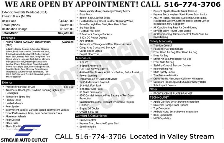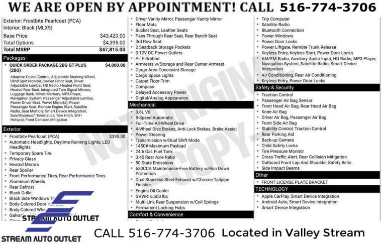 GPS Navigation, Quick Order Package 2BG GT Plus, 6 Speakers, AM/FM radio: SiriusXM, GPS Antenna Input, HD Radio, Integrated Center Stack Radio, Integrated Voice Command w/Bluetooth, Radio data system, Radio: Uconnect 4 w/8.4" Display, Radio: Uconnect 5 Nav w/10.1" Display, SiriusXM w/360L, Air Conditioning, Automatic temperature control, Front dual zone A/C, Rear air conditioning, Rear window defroster, Exterior Mirrors w/Memory, Heated Second Row Seats, Power driver seat, Power steering, Power windows, Radio/Driver Seat/Mirrors Memory, Remote keyless entry, Steering wheel mounted audio controls, Four wheel independent suspension, Rear Load Leveling Suspension, Speed-sensing steering, Traction control, 4-Wheel Disc Brakes, ABS brakes, Anti-whiplash front head restraints, Dual front impact airbags, Dual front side impact airbags, Front anti-roll bar, Knee airbag, Low tire pressure warning, Occupant sensing airbag, Overhead airbag, Rear anti-roll bar, Power Sunroof, Power Liftgate, Brake assist, Electronic Stability Control, ParkView Rear Back-Up Camera, Delay-off headlights, Fully automatic headlights, Panic alarm, Adaptive Cruise Control w/Stop, Speed control, 180 Amp Alternator, Heavy-Duty Engine Cooling, Auto-Dimming Exterior Driver Mirror, Bumpers: body-color, Exterior Mirrors w/Heating Element, Exterior Mirrors w/Supplemental Signals, Front License Plate Bracket, Gloss Black Exterior Mirrors, Heated door mirrors, Power 6x9 Multi-Function Foldaway Mirrors, Power door mirrors, Spoiler, 1-Year Trial (Registration Required), 10.1" Touchscreen Display, 115V Auxiliary Power Outlet, 4G LTE Wi-Fi Hot Spot, Apple CarPlay, Apple CarPlay/Android Auto, Auto-dimming Rear-View mirror, Blind Spot w/Trailer Detection, Cloth Bucket Seats w/Shift Insert, Compass, Connected Travel & Traffic Services, Disassociated Touchscreen Display, Driver door bin, Driver vanity mirror, Dual Remote USB Port - Charge Only, For Details Visit DriveUconnect.com, Front reading lights, Full Speed Forward Collision Warning Plus, Garage door transmitter, Global Telematics Box Module (TBM), Google Android Auto, Heated steering wheel, Illuminated entry, Leather steering wheel, Leather Wrapped Door Panels, LED Auxiliary Low Beam & Turn Signal, Outside temperature display, Overhead console, Passenger vanity mirror, Power Tilt & Telescopic Steering Column, Rear reading lights, Rear seat center armrest, Red Accent Stitching, SiriusXM Guardian - Included Trial (B), Sport steering wheel, Tachometer, Telescoping steering wheel, Tilt steering wheel, Trip computer, USB Host Flip, Voltmeter, 3rd row seats: split-bench, Front Bucket Seats, Heated front seats, Leather Trimmed Bucket Seats, Power 8-Way Driver Memory 8-Way Passenger Seats, Power Driver/Passenger 4-Way Lumbar Adjust, Split folding rear seat, Ventilated Front Seats, Black Roof Rails, Floor Console w/Leather Armrest, Front Center Armrest w/Storage, Integrated Roof Rail Crossbars, Passenger door bin, 7 & 4 Pin Wiring Harness, Class IV Receiver Hitch, Trailer Brake Control, Alloy wheels, Wheels: 20" x 8.0" Fine Silver, Rear window wiper, Speed-Sensitive Wipers, Variably intermittent wipers, 3.45 Rear Axle Ratio, * NYS INSPECTION INCLUDED *, * FULL INTERIOR / EXTERIOR DETAIL *, * BLUETOOTH *, * LIMITED NYS LEMON LAW WARRANTY INCLUDED *, *FRESH OIL CHANGE *, * 150 MULTI POINT INSPECTION *