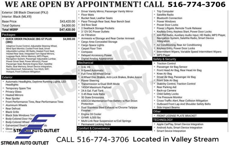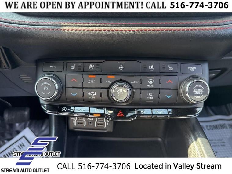 GPS Navigation, Quick Order Package 2BG GT Plus, 6 Speakers, AM/FM radio: SiriusXM, GPS Antenna Input, HD Radio, Integrated Center Stack Radio, Integrated Voice Command w/Bluetooth, Radio data system, Radio: Uconnect 4 w/8.4" Display, Radio: Uconnect 5 Nav w/10.1" Display, SiriusXM w/360L, Air Conditioning, Automatic temperature control, Front dual zone A/C, Rear air conditioning, Rear window defroster, Exterior Mirrors w/Memory, Heated Second Row Seats, Power driver seat, Power steering, Power windows, Radio/Driver Seat/Mirrors Memory, Remote keyless entry, Steering wheel mounted audio controls, Four wheel independent suspension, Rear Load Leveling Suspension, Speed-sensing steering, Traction control, 4-Wheel Disc Brakes, ABS brakes, Dual front impact airbags, Dual front side impact airbags, Front anti-roll bar, Knee airbag, Low tire pressure warning, Occupant sensing airbag, Overhead airbag, Rear anti-roll bar, Power Sunroof, Power Liftgate, Brake assist, Electronic Stability Control, ParkView Rear Back-Up Camera, Delay-off headlights, Fully automatic headlights, Panic alarm, Adaptive Cruise Control w/Stop, Speed control, 180 Amp Alternator, Heavy-Duty Engine Cooling, Auto-Dimming Exterior Driver Mirror, Bumpers: body-color, Exterior Mirrors w/Heating Element, Exterior Mirrors w/Supplemental Signals, Front License Plate Bracket, Gloss Black Exterior Mirrors, Heated door mirrors, Power 6x9 Multi-Function Foldaway Mirrors, Power door mirrors, Spoiler, 1-Year Trial (Registration Required), 10.1" Touchscreen Display, 115V Auxiliary Power Outlet, 4G LTE Wi-Fi Hot Spot, Apple CarPlay, Apple CarPlay/Android Auto, Auto-dimming Rear-View mirror, Blind Spot w/Trailer Detection, Cloth Bucket Seats w/Shift Insert, Compass, Connected Travel & Traffic Services, Disassociated Touchscreen Display, Driver door bin, Driver vanity mirror, Dual Remote USB Port - Charge Only, For Details Visit DriveUconnect.com, Front reading lights, Full Speed Forward Collision Warning Plus, Garage door transmitter, Global Telematics Box Module (TBM), Google Android Auto, Heated steering wheel, Illuminated entry, Leather steering wheel, Leather Wrapped Door Panels, LED Auxiliary Low Beam & Turn Signal, Outside temperature display, Overhead console, Passenger vanity mirror, Power Tilt & Telescopic Steering Column, Rear reading lights, Rear seat center armrest, Red Accent Stitching, SiriusXM Guardian - Included Trial (B), Sport steering wheel, Tachometer, Telescoping steering wheel, Tilt steering wheel, Trip computer, USB Host Flip, Voltmeter, 3rd row seats: split-bench, Front Bucket Seats, Heated front seats, Leather Trimmed Bucket Seats, Power 8-Way Driver Memory 8-Way Passenger Seats, Power Driver/Passenger 4-Way Lumbar Adjust, Split folding rear seat, Ventilated Front Seats, Black Roof Rails, Floor Console w/Leather Armrest, Front Center Armrest w/Storage, Integrated Roof Rail Crossbars, Passenger door bin, 7 & 4 Pin Wiring Harness, Class IV Receiver Hitch, Trailer Brake Control, Alloy wheels, Wheels: 20" x 8.0" Fine Silver, Rear window wiper, Speed-Sensitive Wipers, Variably intermittent wipers, 3.45 Rear Axle Ratio, * NYS INSPECTION INCLUDED *, * FULL INTERIOR / EXTERIOR DETAIL *, * BLUETOOTH *, * LIMITED NYS LEMON LAW WARRANTY INCLUDED *, *FRESH OIL CHANGE *, * 150 MULTI POINT INSPECTION *