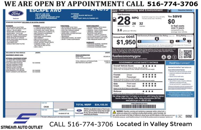 For more information on this 2024 Ford Escape, please call Stream Auto Outlet Valley Stream at (516) 774-3706 or with the contact form on this page. This vehicle's vin number is 1FMCU9MNXRUA74815 and is recorded as being in stock at Stream Auto Outlet Valley Stream at 324 W Merrick Rd in Valley Stream. See all cars from this dealership.