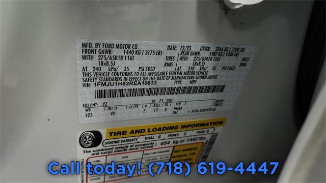 Navigation system: Connected Navigation, Equipment Group 202A High Package, 6 Speakers, AM/FM radio: SiriusXM with 360L, Radio data system, Radio: AM/FM Stereo w/MP3 Capable, SiriusXM w/360L, SYNC 4 w/Enhanced Voice Recognition, Air Conditioning, Automatic temperature control, Front dual zone A/C, Rear air conditioning, Rear window defroster, 110V/150W AC Power Outlet, Power driver seat, Power steering, Power windows, Power-Adjustable Pedals w/Memory, Remote keyless entry, Remote Start, Steering wheel mounted audio controls, Four wheel independent suspension, Speed-sensing steering, Traction control, 4-Door Intelligent Access (Lock/Unlock), 4-Wheel Disc Brakes, ABS brakes, Dual front impact airbags, Dual front side impact airbags, Emergency communication system: SYNC 4 911 Assist, Front anti-roll bar, Low tire pressure warning, Occupant sensing airbag, Overhead airbag, Rear anti-roll bar, SecuriCode Keyless Entry Pad, Power Liftgate, Brake assist, Electronic Stability Control, Exterior Parking Camera Rear, Auto High-beam Headlights, Delay-off headlights, Fully automatic headlights, Advanced Security Pack, Panic alarm, Security system, Speed control, Accent Color Painted Rear Bumper, Bumpers: body-color, Heated door mirrors, Power door mirrors, Power-Folding Sideview Mirrors w/Autofold, Spoiler, 3rd Row Vinyl Head Restraints, ActiveX-Trimmed 1st & 2nd Row Seats, Ambient Lighting, Auto-dimming Rear-View mirror, Cloth Front Captain's Chairs, Compass, Driver door bin, Driver vanity mirror, Front reading lights, Garage door transmitter, Heated Steering Wheel, Illuminated entry, Leather steering wheel, Outside temperature display, Overhead console, Passenger vanity mirror, Power Tilt/Telescopic Steering Wheel w/Memory, Rear reading lights, Tachometer, Telescoping steering wheel, Tilt steering wheel, Trip computer, Voltmeter, Wireless Charging Pad, 2nd Row Power-Folding 40/20/40 ActiveX Bench Seat, 2nd Row Power-Folding Captain's Chairs, 3rd row seats: split-bench, Front Bucket Seats, Front Center Armrest, Heated/Ventilated Front Seats, Reclining 3rd row seat, Split folding rear seat, Passenger door bin, 18" Machined-Face Aluminum Wheels, Alloy wheels, Rear window wiper, Speed-Sensitive Wipers, Variably intermittent wipers, 3.31 Axle Ratio