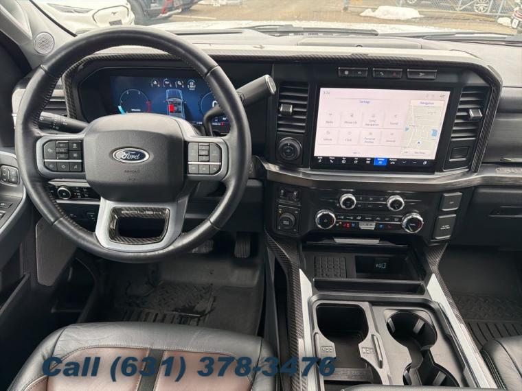 Navigation system: Connected Navigation (includes complimentary 1-year trial), F-250 >10K GVWR Package, High Capacity 11.6" Axle Upgrade Package, Lariat Ultimate Package, Order Code 608A, Sport Appearance Package, 8 Speakers, AM/FM radio: SiriusXM with 360L, Radio: B&O Sound System by Bang & Olufsen, SiriusXM Radio w/360L, SYNC 4 w/Enhanced Voice Recognition, Air Conditioning, Automatic temperature control, Front dual zone A/C, Rapid-Heat Supplemental Cab Heater, Rear window defroster, Memory seat, Pedal memory, Power driver seat, Power steering, Power windows, Remote keyless entry, Steering wheel memory, Steering wheel mounted audio controls, Traction control, 4-Wheel Disc Brakes, ABS brakes, Body-Color Front & Rear Bumpers, Dual front impact airbags, Dual front side impact airbags, Emergency communication system: SYNC 4 911 Assist, Front anti-roll bar, Low tire pressure warning, Overhead airbag, Twin Panel Power Moonroof, Brake assist, Electronic Stability Control, Exterior Parking Camera Rear, Auto High-beam Headlights, Delay-off headlights, Front fog lights, Fully automatic headlights, Panic alarm, Security system, Speed control, 410 Amp Dual Alternators, Dual 68 AH/65 AGM Batteries, Engine Block Heater, Bumpers: chrome, Chrome Exhaust Tip, Dark Painted Grille, Front & Rear Wheel Well Liners (Pre-Installed), Front License Plate Bracket, Heated door mirrors, LED Roof Clearance Lights, Platform Running Boards, Power door mirrors, Rear step bumper, Sport 4x4 Box Side Decal, Turn signal indicator mirrors, Adjustable pedals, Auto tilt-away steering wheel, Auto-dimming Rear-View mirror, Compass, Driver door bin, Driver vanity mirror, Flow-Through Console, Ford Pro Upfit Integration System, Front Leather-Trimmed 40/Console/40 Seats, Front reading lights, Garage door transmitter, Heated steering wheel, Illuminated entry, Leather steering wheel, Outside temperature display, Overhead console, Passenger vanity mirror, Rear reading lights, Rear seat center armrest, Tachometer, Telescoping steering wheel, Tilt steering wheel, Trip computer, Front Bucket Seats, Front Center Armrest, Heated front seats, Heated rear seats, Power passenger seat, Split folding rear seat, Ventilated front seats, Passenger door bin, Black Tow Hooks, Alloy wheels, Wheels: 18" Bright Machined & Carbonized Gray Alum, Wheels: 20" Dark Carbonized Gray Painted Aluminum, Rain sensing wipers, Variably intermittent wipers