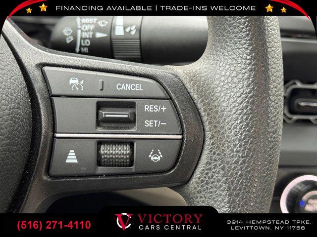 4 Speakers, AM/FM radio, Radio data system, Radio: 160-Watt AM/FM Audio System, Air Conditioning, Automatic temperature control, Rear window defroster, Power steering, Power windows, Remote keyless entry, Steering wheel mounted audio controls, Four wheel independent suspension, Speed-sensing steering, Traction control, 4-Wheel Disc Brakes, ABS brakes, Dual front impact airbags, Dual front side impact airbags, Emergency communication system: HondaLink Assist, Front anti-roll bar, Knee airbag, Low tire pressure warning, Occupant sensing airbag, Overhead airbag, Rear anti-roll bar, Rear side impact airbag, Brake assist, Electronic Stability Control, Lane departure: Lane Keeping Assist System (LKAS) active, Exterior Parking Camera Rear, Auto High-beam Headlights, Delay-off headlights, Fully automatic headlights, Panic alarm, Security system, Adaptive Cruise Control: Adaptive Cruise Control (ACC) with Low-Speed Follow, Speed control, Bumpers: body-color, Power door mirrors, Apple CarPlay/Android Auto, Compass, Driver door bin, Driver vanity mirror, Front reading lights, Illuminated entry, Outside temperature display, Overhead console, Passenger vanity mirror, Rear reading lights, Rear seat center armrest, Tachometer, Telescoping steering wheel, Tilt steering wheel, Trip computer, Fabric Seat Trim, Front Bucket Seats, Front Center Armrest, Passenger door bin, Alloy wheels, Wheels: 17" x 7.5" Blade Silver, Speed-Sensitive Wipers, Variably intermittent wipers