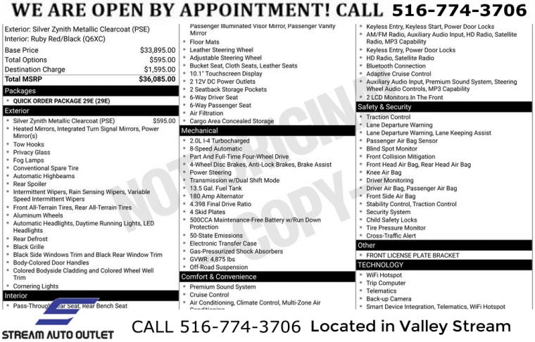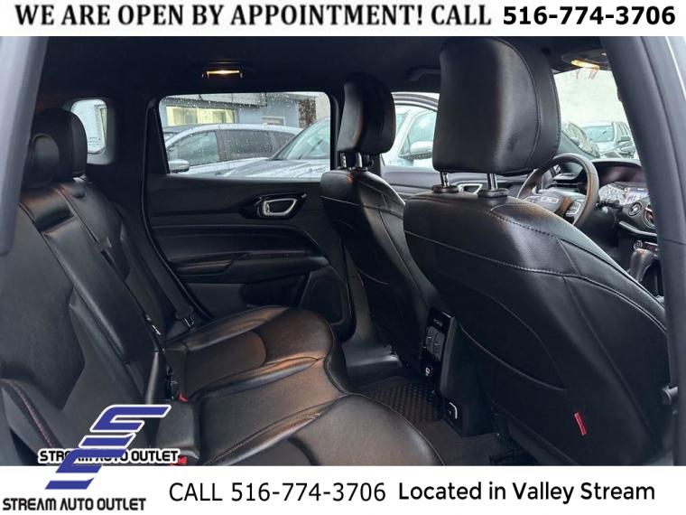 Quick Order Package 29E, 6 Speakers, AM/FM radio: SiriusXM, Radio: Uconnect 5 w/10.1" Display, SiriusXM Radio Service, Air Conditioning, Automatic temperature control, Front dual zone A/C, Rear window defroster, Power steering, Power windows, Remote keyless entry, Steering wheel mounted audio controls, Four wheel independent suspension, Traction control, 4-Wheel Disc Brakes, ABS brakes, Dual front impact airbags, Dual front side impact airbags, Emergency communication system: Jeep Connect, Front anti-roll bar, Knee airbag, Low tire pressure warning, Occupant sensing airbag, Overhead airbag, Rear anti-roll bar, Brake assist, Electronic Stability Control, ParkView Rear Back-Up Camera, Auto High-beam Headlights, Delay-off headlights, Front fog lights, Fully automatic headlights, Panic alarm, Security system, Speed control, Bumpers: body-color, Front License Plate Bracket, Heated door mirrors, Power door mirrors, Spoiler, Turn signal indicator mirrors, 10.1" Touchscreen Display, 4G LTE Wi-Fi Hot Spot, Auto-dimming Rear-View mirror, Compass, Driver door bin, Driver vanity mirror, For Details, Visit DriveUconnect.com, For More Info, Call 800-643-2112, Front reading lights, Global Telematics Box Module (TBM), Illuminated entry, Leather Shift Knob, Leather steering wheel, Outside temperature display, Overhead console, Passenger vanity mirror, Premium Cloth/Leather Trim Bucket Seats, Rear seat center armrest, SiriusXM Guardian - Included Trial (B), Tachometer, Telescoping steering wheel, Tilt steering wheel, Trip computer, Front Bucket Seats, Split folding rear seat, Front Center Armrest w/Storage, Passenger door bin, Alloy wheels, Wheels: 17" x 6.5" Painted Black Aluminum, Rain sensing wipers, Rear window wiper, Variably intermittent wipers, 4.398 Final Drive Ratio, * NYS INSPECTION INCLUDED *, * FULL INTERIOR / EXTERIOR DETAIL *, * BLUETOOTH *, * LIMITED NYS LEMON LAW WARRANTY INCLUDED *, *FRESH OIL CHANGE *, * 150 MULTI POINT INSPECTION *