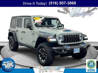 One owner. Earl Clearcoat exterior and Black interior, Rubicon trim. Onboard Communications System, iPod/MP3 Input, Satellite Radio, Back-Up Camera, 4x4, Tow Hitch, Alloy Wheels, BLACK 3-PIECE HARD TOP , ENGINE: 2.0L I4 DOHC DI TURBO PHEV, TRANSMISSION: 8-SPEED AUTO 8P75PH PHE. Turbo. Approx. Original Base Sticker Price: $61,400*.KEY FEATURES INCLUDE4x4, Back-Up Camera, Satellite Radio, iPod/MP3 Input, Onboard Communications System.OPTION PACKAGESBLACK 3-PIECE HARD TOP Freedom Panel Storage Bag, Rear Window Defroster, Rear Window Wiper/Washer, No Soft Top, ENGINE: 2.0L I4 DOHC DI TURBO PHEV (STD) Jeep Rubicon with Earl Clearcoat exterior and Black interior features a 4 Cylinder Engine with 375 HP at 5250 RPM*.MORE ABOUT USWe hand select the finest automobiles possible, recondition as required so you do not have to worry about anything shortly down the road. Our Certified vehicles for example all have more than 50% brake life, most have brand new brakes installed front and rear and it does not end there.WESTBURY VIPAmericas #1 VIP Plus Program includes Complimentary Loaner Cars, UnlimitedOil & Filter changes for 1 yr. & then included with every factorymaintenance, Courtesy Shuttle to work, home or any other location, ExpressLube 30 minutes or less w/ no appointment necessary, Complimentary NYSI, 24/7 Rescue & Towing.