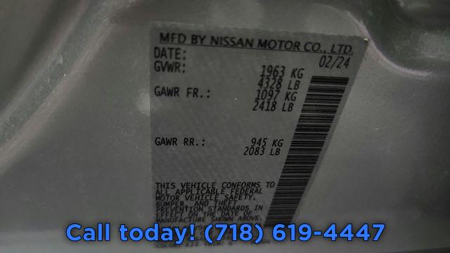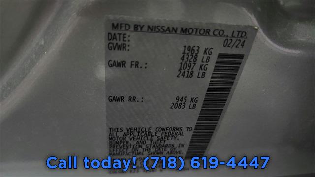 6 Speakers, AM/FM radio: SiriusXM, Radio data system, Radio: AM/FM Audio System, Air Conditioning, Rear window defroster, Power driver seat, Power steering, Power windows, Remote keyless entry, Steering wheel mounted audio controls, Four wheel independent suspension, Speed-sensing steering, Traction control, 4-Wheel Disc Brakes, ABS brakes, Dual front impact airbags, Dual front side impact airbags, Front anti-roll bar, Knee airbag, Low tire pressure warning, Occupant sensing airbag, Overhead airbag, Rear anti-roll bar, Rear side impact airbag, Blind Spot Warning, Brake assist, Electronic Stability Control, Rear Parking Sensors, Auto High-beam Headlights, Delay-off headlights, Fully automatic headlights, Panic alarm, Security system, Speed control, Bumpers: body-color, Power door mirrors, Cloth Seat Trim, Driver door bin, Driver vanity mirror, Floor Mats/Trunk Mat/Hideaway Net, Front reading lights, Illuminated entry, NissanConnect featuring Apple CarPlay, Outside temperature display, Overhead console, Passenger vanity mirror, Rear reading lights, Rear seat center armrest, Tachometer, Telescoping steering wheel, Tilt steering wheel, Trip computer, Front Bucket Seats, Front Center Armrest, Split folding rear seat, Passenger door bin, 17" Alloy Wheels, Alloy wheels, Speed-Sensitive Wipers, Variably intermittent wipers