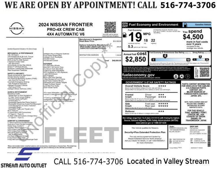 For more information on this 2024 Nissan Frontier, please call Stream Auto Outlet Valley Stream at (516) 774-3706 or with the contact form on this page. This vehicle's vin number is 1N6ED1EK5RN651180 and is recorded as being in stock at Stream Auto Outlet Valley Stream at 324 W Merrick Rd in Valley Stream. See all cars from this dealership.