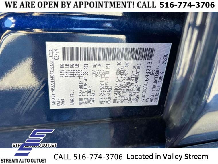 6 Speakers, AM/FM radio: SiriusXM, Radio data system, Radio: AM/FM NissanConnect, Air Conditioning, Automatic temperature control, Front dual zone A/C, Rear window defroster, Power driver seat, Power steering, Power windows, Remote keyless entry, Steering wheel mounted audio controls, Four wheel independent suspension, Traction control, 4-Wheel Disc Brakes, ABS brakes, Dual front impact airbags, Dual front side impact airbags, Emergency communication system: NissanConnect Services, Front anti-roll bar, Knee airbag, Low tire pressure warning, Occupant sensing airbag, Overhead airbag, Rear anti-roll bar, Rear side impact airbag, Power Liftgate, Brake assist, Electronic Stability Control, Rear Parking Sensors, Auto High-beam Headlights, Delay-off headlights, Fully automatic headlights, Panic alarm, Speed control, Bumpers: body-color, Heated door mirrors, Power door mirrors, Spoiler, Driver door bin, Driver vanity mirror, Front reading lights, Illuminated entry, NissanConnect featuring Apple CarPlay and Android Auto, Outside temperature display, Overhead console, Passenger vanity mirror, Rear seat center armrest, Tachometer, Telescoping steering wheel, Tilt steering wheel, Trip computer, Cloth Seat Trim w/Patterned Inserts, Front Bucket Seats, Front Center Armrest, Split folding rear seat, Passenger door bin, Alloy wheels, Wheels: 18" Dark Painted Machine Finished Alloy, Rear window wiper, Speed-Sensitive Wipers, Variably intermittent wipers, 5.676 Axle Ratio, * NYS INSPECTION INCLUDED *, * FULL INTERIOR / EXTERIOR DETAIL *, * BLUETOOTH *, * LIMITED NYS LEMON LAW WARRANTY INCLUDED *, *FRESH OIL CHANGE *, * 150 MULTI POINT INSPECTION *