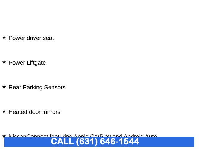 6 Speakers, AM/FM radio: SiriusXM, Radio data system, Radio: AM/FM NissanConnect, Air Conditioning, Automatic temperature control, Front dual zone A/C, Rear window defroster, Power driver seat, Power steering, Power windows, Remote keyless entry, Steering wheel mounted audio controls, Four wheel independent suspension, Traction control, 4-Wheel Disc Brakes, ABS brakes, Dual front impact airbags, Dual front side impact airbags, Emergency communication system: NissanConnect Services, Front anti-roll bar, Knee airbag, Low tire pressure warning, Occupant sensing airbag, Overhead airbag, Rear anti-roll bar, Rear side impact airbag, Power Liftgate, Brake assist, Electronic Stability Control, Rear Parking Sensors, Auto High-beam Headlights, Delay-off headlights, Fully automatic headlights, Panic alarm, Speed control, Bumpers: body-color, Heated door mirrors, Power door mirrors, Spoiler, Driver door bin, Driver vanity mirror, Front reading lights, Illuminated entry, NissanConnect featuring Apple CarPlay and Android Auto, Outside temperature display, Overhead console, Passenger vanity mirror, Rear seat center armrest, Tachometer, Telescoping steering wheel, Tilt steering wheel, Trip computer, Cloth Seat Trim w/Patterned Inserts, Front Bucket Seats, Front Center Armrest, Split folding rear seat, Passenger door bin, Alloy wheels, Wheels: 18" Dark Painted Machine Finished Alloy, Rear window wiper, Speed-Sensitive Wipers, Variably intermittent wipers, 5.676 Axle Ratio