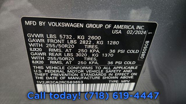 6 Speakers, AM/FM radio: SiriusXM with 360L, Radio data system, Radio: MIB3 Composition Media, Air Conditioning, Automatic temperature control, Front dual zone A/C, Rear air conditioning, Rear window defroster, Power driver seat, Power steering, Power windows, Remote keyless entry, Steering wheel mounted audio controls, Four wheel independent suspension, Speed-sensing steering, Standard Suspension, Traction control, 4-Wheel Disc Brakes, ABS brakes, Dual front impact airbags, Dual front side impact airbags, Emergency communication system: VW Car-Net Safe & Secure 5-year, Front anti-roll bar, Low tire pressure warning, Occupant sensing airbag, Overhead airbag, Rear anti-roll bar, Power Liftgate, Brake assist, Electronic Stability Control, Exterior Parking Camera Rear, Delay-off headlights, Front fog lights, Fully automatic headlights, Panic alarm, Security system, Speed control, Bumpers: body-color, Heated door mirrors, Power door mirrors, Spoiler, Turn signal indicator mirrors, Auto-dimming Rear-View mirror, Compass, Driver door bin, Driver vanity mirror, Front reading lights, Heated steering wheel, Heated/Actively Ventilated Front Bucket Seats, Illuminated entry, Outside temperature display, Overhead console, Passenger vanity mirror, Rear reading lights, Rear seat center armrest, Tachometer, Telescoping steering wheel, Tilt steering wheel, Trip computer, 3rd row seats: split-bench, Front Bucket Seats, Front Center Armrest, Heated front seats, Perforated V-Tex Leatherette Seating Surfaces, Split folding rear seat, Ventilated front seats, Passenger door bin, Alloy wheels, Wheels: 20" 2-Tone Machined Alloy, Rain sensing wipers, Rear window wiper, Variably intermittent wipers, 3.60 Axle Ratio